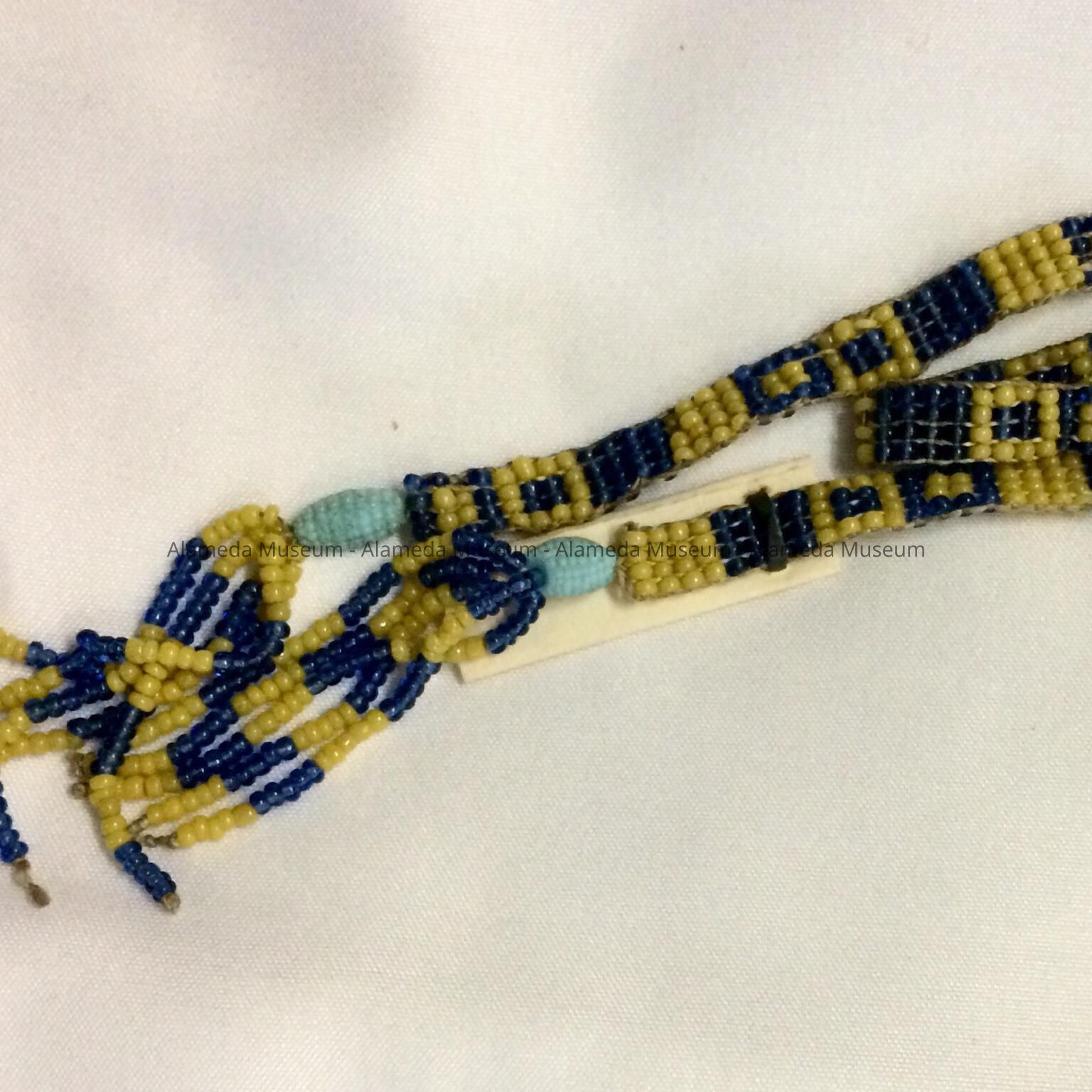 Description: Necklace of woven beads (yellow & blue glass) that appears to have been made for a child or a doll.
