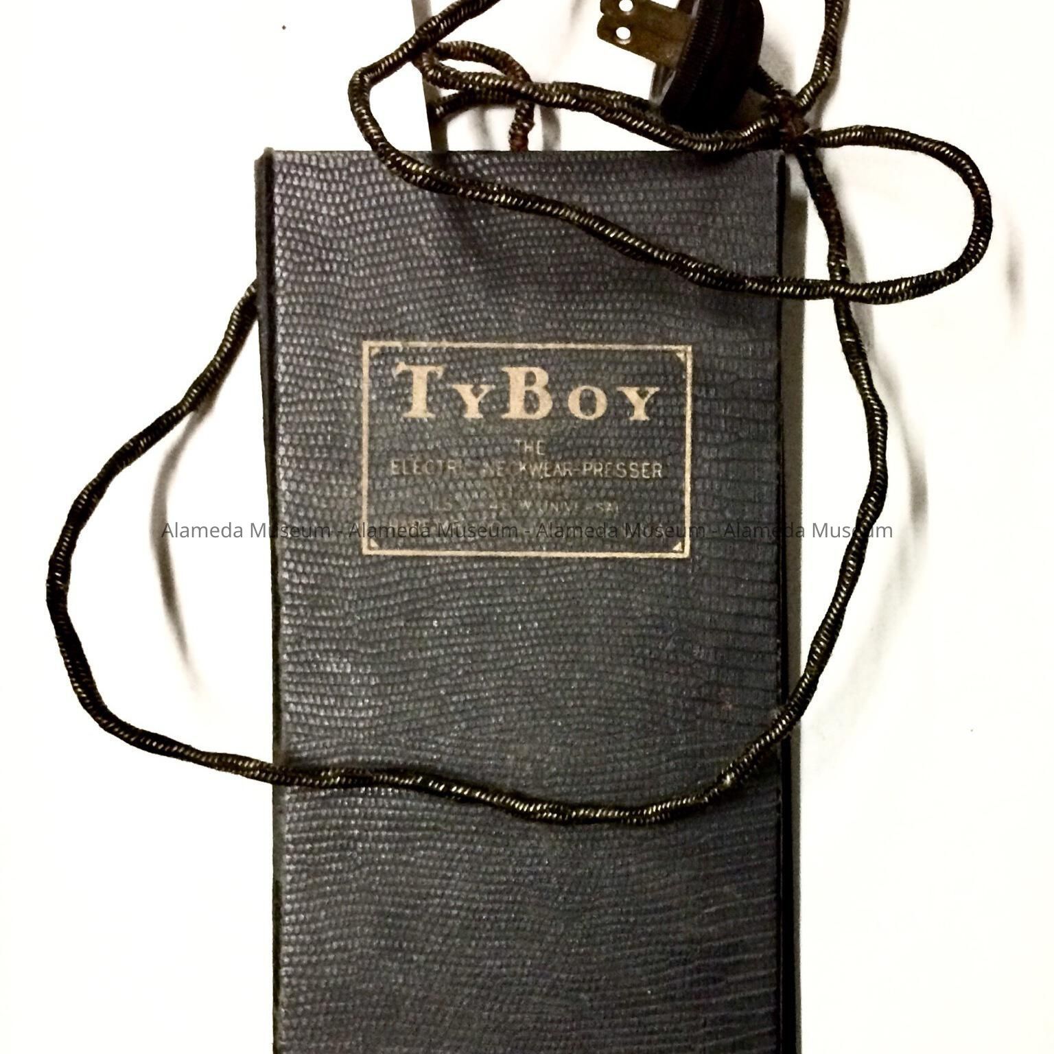 AN ELECTRIC NECKTIE PRESSER, ELONGATED IN SHAPE, BOOKLET STYLE. THE FOLDER IS CONNECTED TO AN ELECTRIC CORD WHICH IS COVERED IN YELLOW- AND BLACKCOLORED SILK. THE PRESSER IS COVERED IN STIPPLED IMITATION BLACK-COLORED LEATHER, AND BEARS A PRINTED CAPTION IN GOLD-COLORED TYPE WHICH READS, "TY BOY, THE ELECTRIC NECKWEAR PRESSER." INTERIOR OF DEVICE HAS A TAN-COLORED LINEN MATERIAL AND AN ALUMINUM PADDLE.