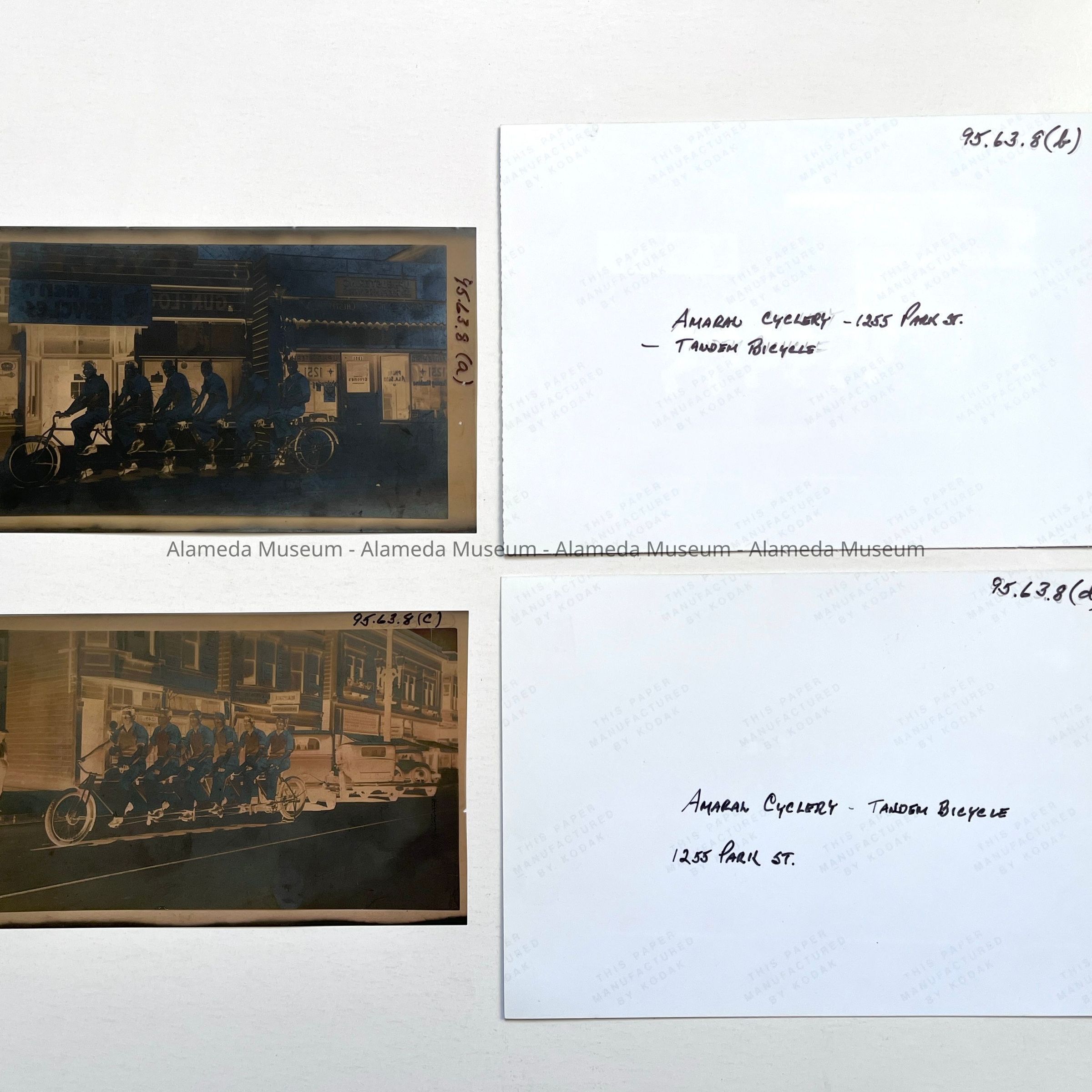 a-b: View of six men seated on a tandem bicycle in front of Amaral's Cyclery.