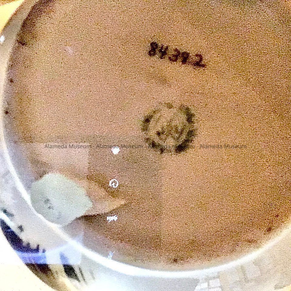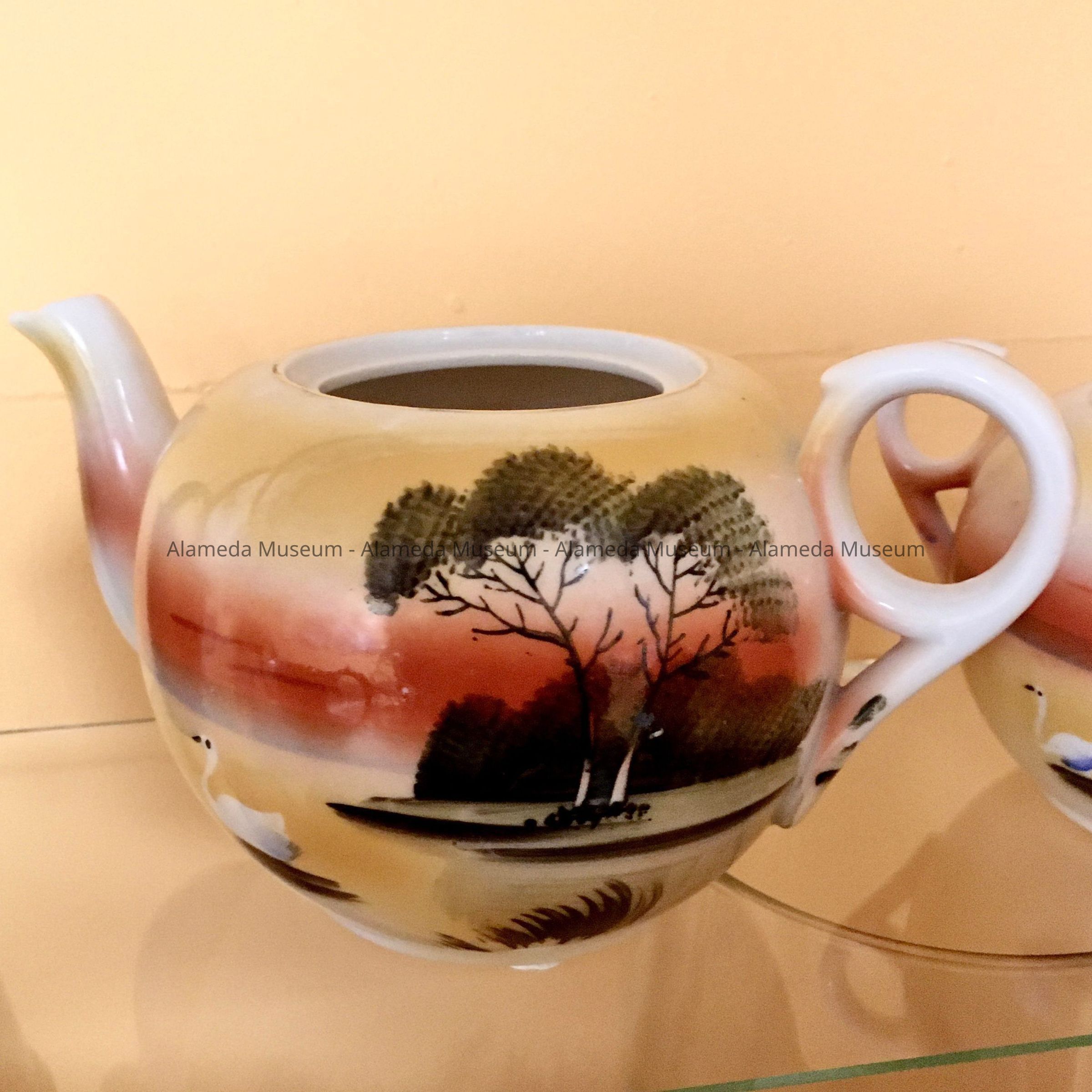 Description: Porcelain teapot (cover missing) hand painted (subject scene of lake with single swan, trees in the background). Dominate colors of orange and gold (fired) crudely painted on cheap mass-produced china. Signature on bottom of item (in green) "Hand Paint, Made in Japan, and double triangles (joined) containing capital T's (company mark)".