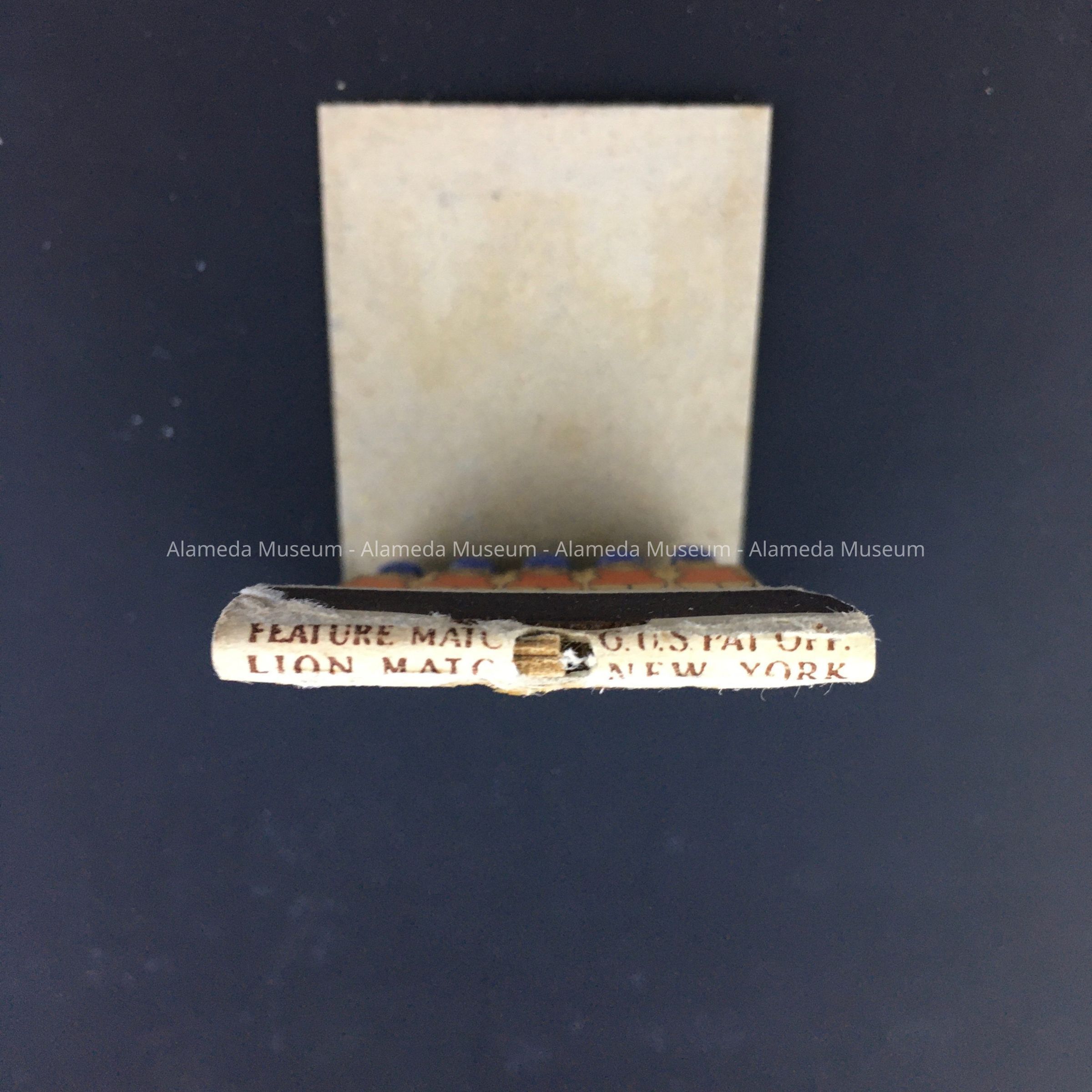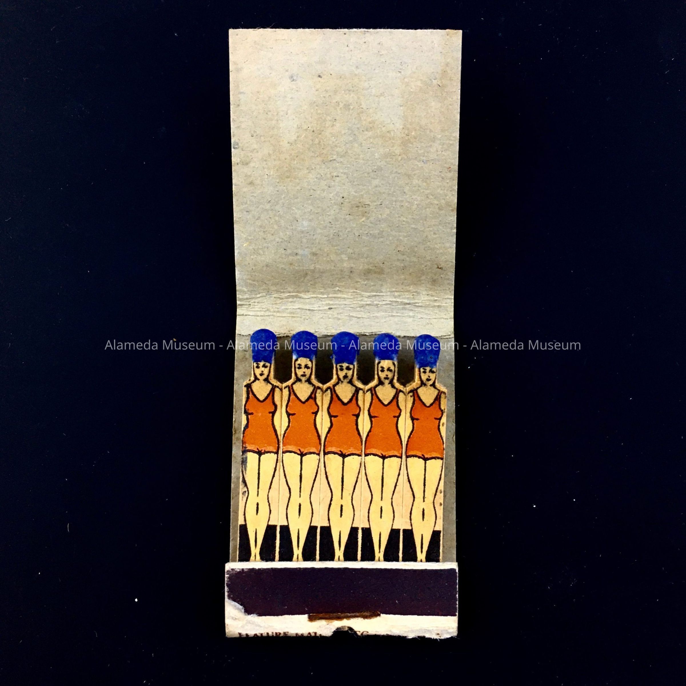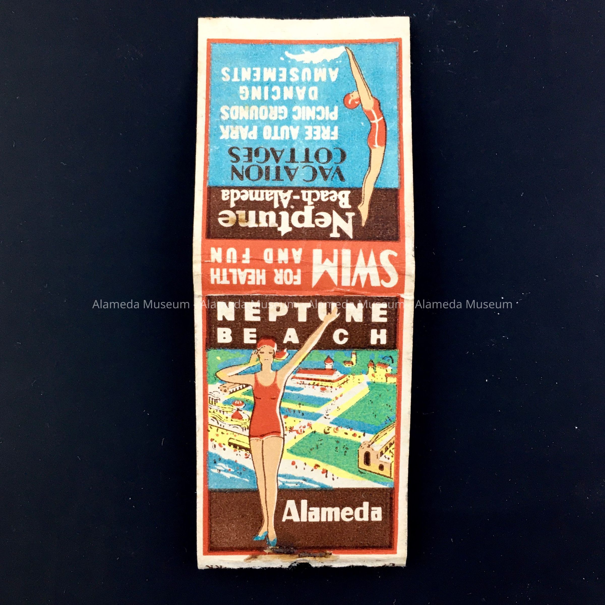 Description: Folding matchbook cover of white card stock, with white and black type on blue and brown background in orange-red frame, featuring on one side an image of a woman in red swimsuit before a birds-eye view drawing of pools, buildings, and rollercoasters, stating 'Neptune Beach Alameda' and on the back, a woman in red swimsuit diving, stating 'Swim for Health and Fun', Neptune Beach Alameda' and (in black type:) 'Vacation Cottages' and (in white type:) 'Free Auto Park, Picnic Grounds, Dancing, Amusements'. Inside are 5 matches in the shape of women in red swimsuits and blue swim caps, the caps being the ignitable part of the matches. Underside has maker's text: 'Feature Match O.G.S. Pat. Off. Lion Matc[h] New York'.