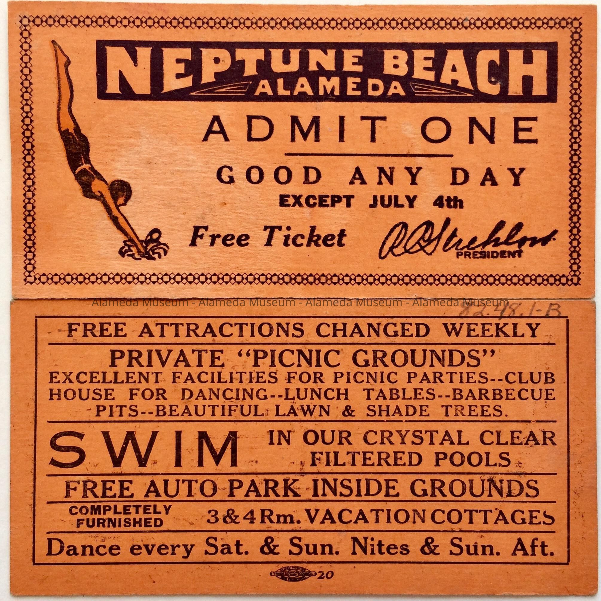 Description: Tickets (2) printed on heavy orange colored stock, with heading in bold type "Neptune Beach, Alameda", and illustrated with a diving girl.