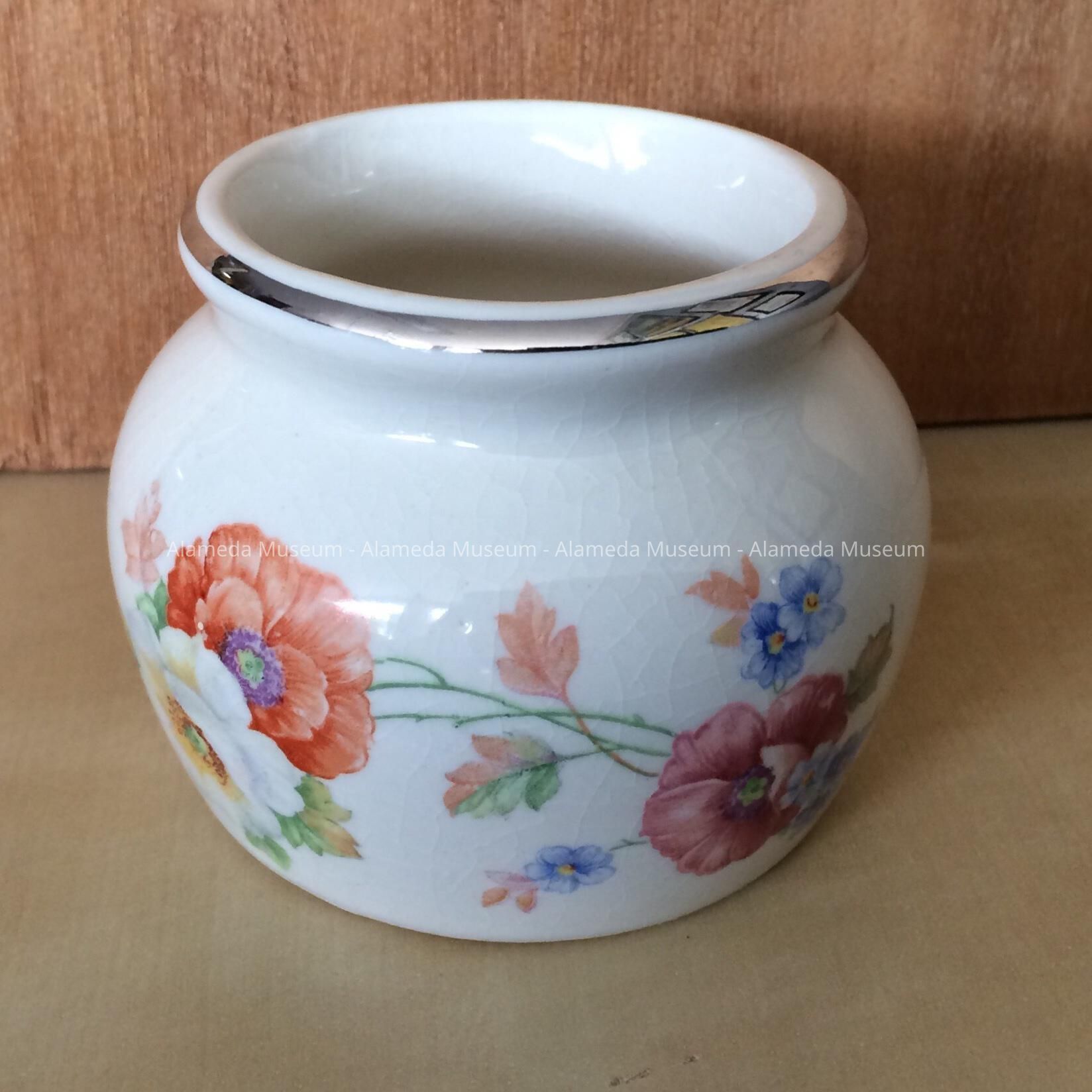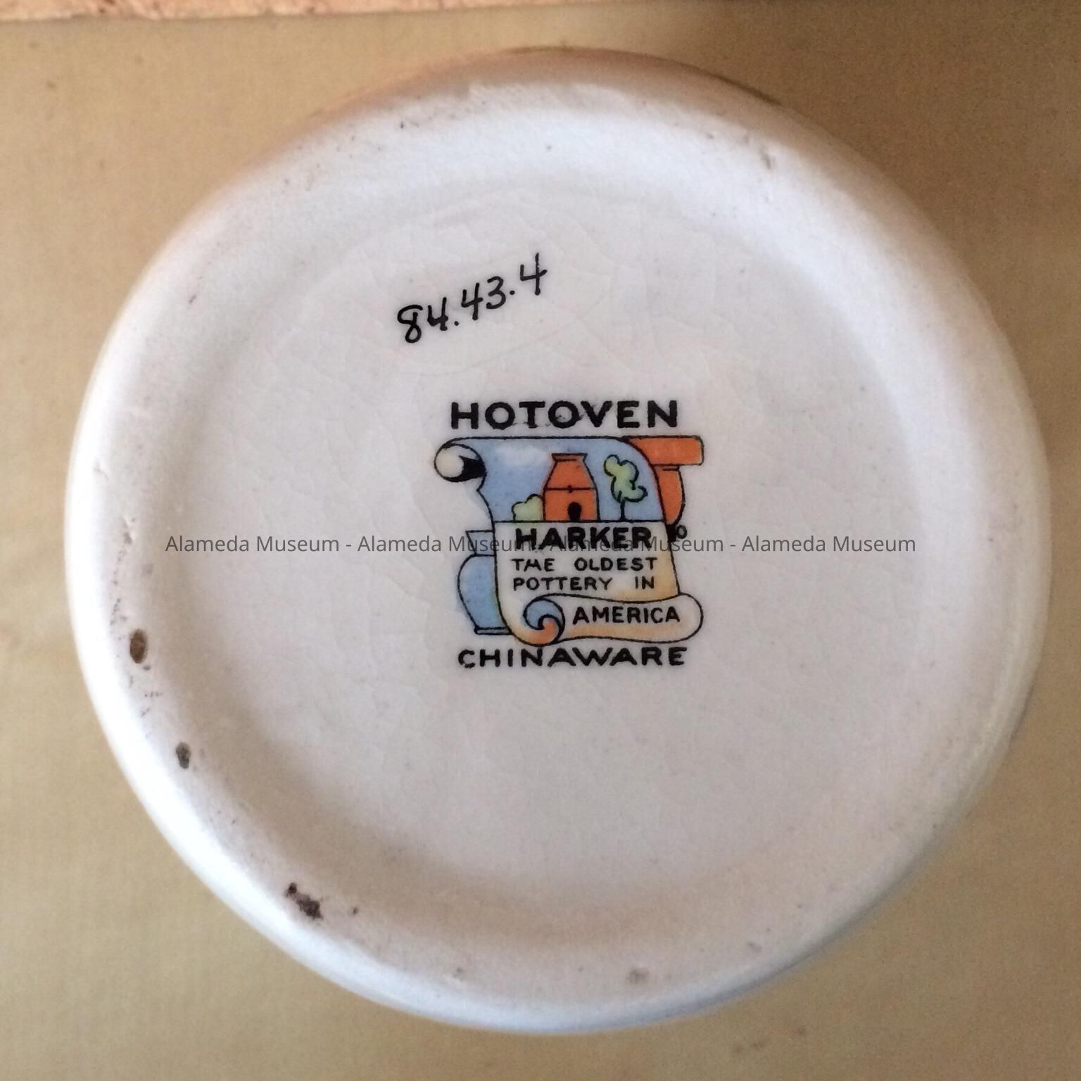 Description: Cream colored semi-porcelain bean pot, decorated with polychrome transfer of stylized flowers. Rim accentuated with silver. Signed "Hotoven-Harker, The Oldest Pottery in America, Chinaware".