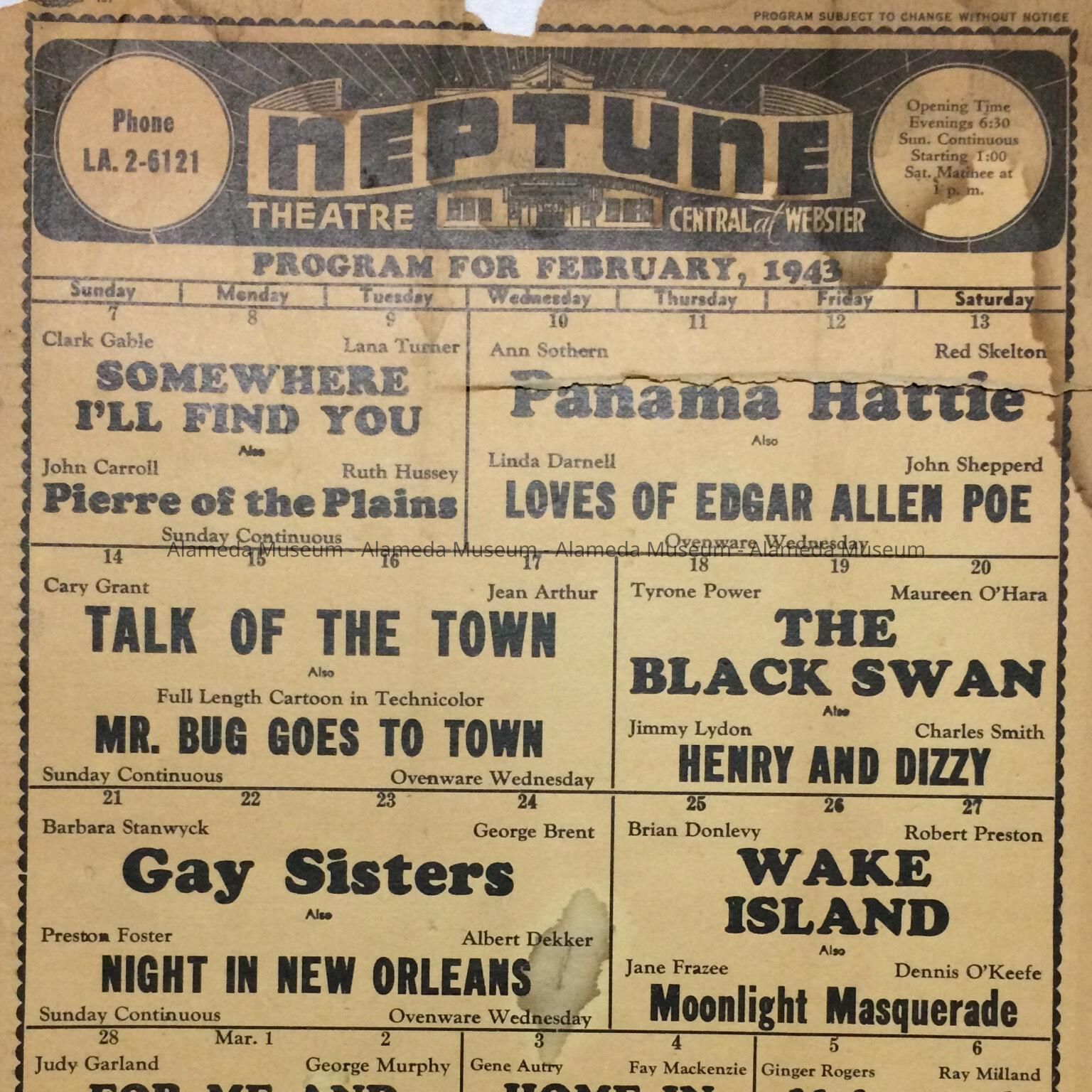 History of Object: It is a program for the coming attractions for February, 1943 for the Neptune Theatre, Central at Webster. (Now demolished. )