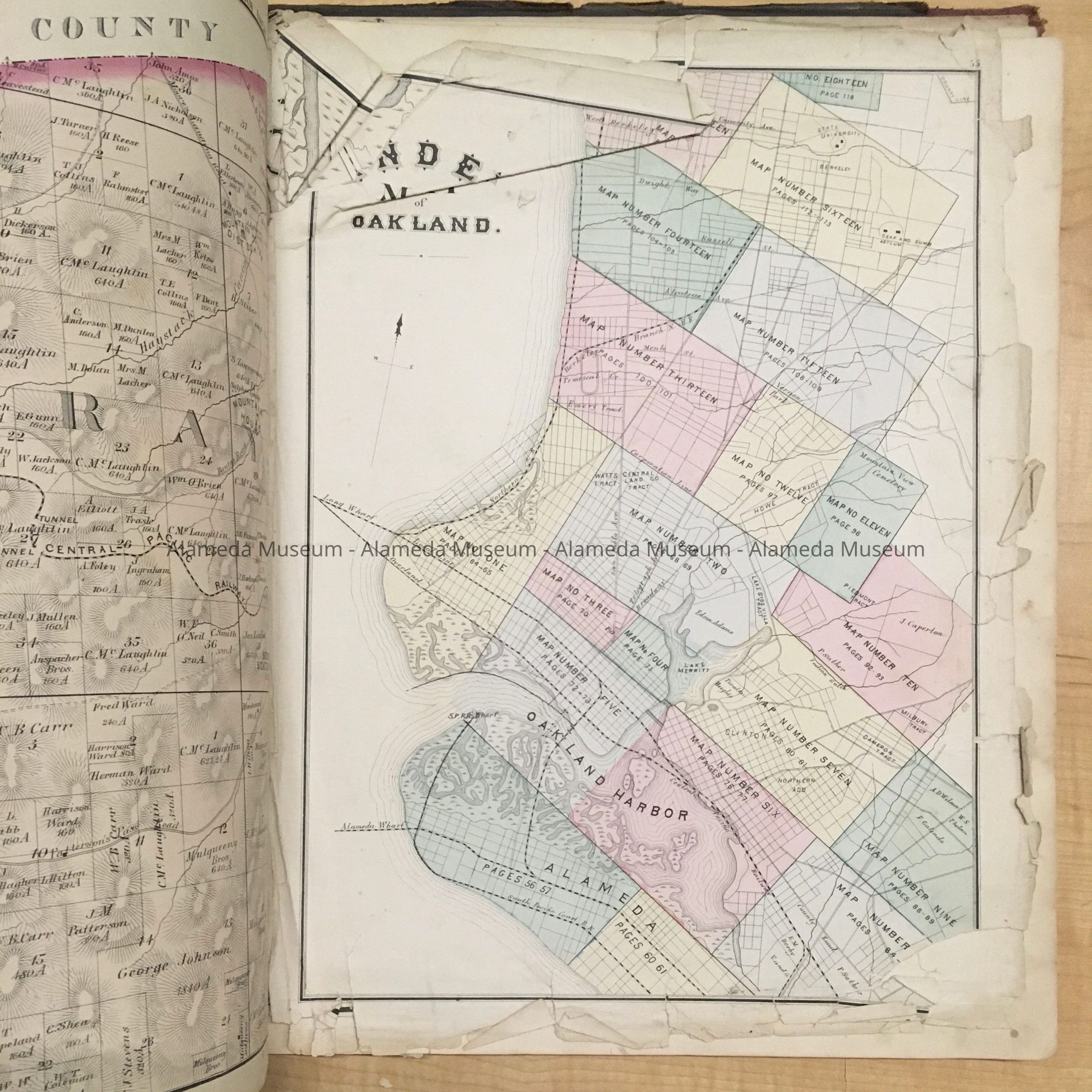 Book entitled "New Historical Atlas of Alameda County'' which includes maps of Alameda, broken into tracts, pages 56, 57, 60, & 61, and some biographical information (business directory) of local citizens of the period.