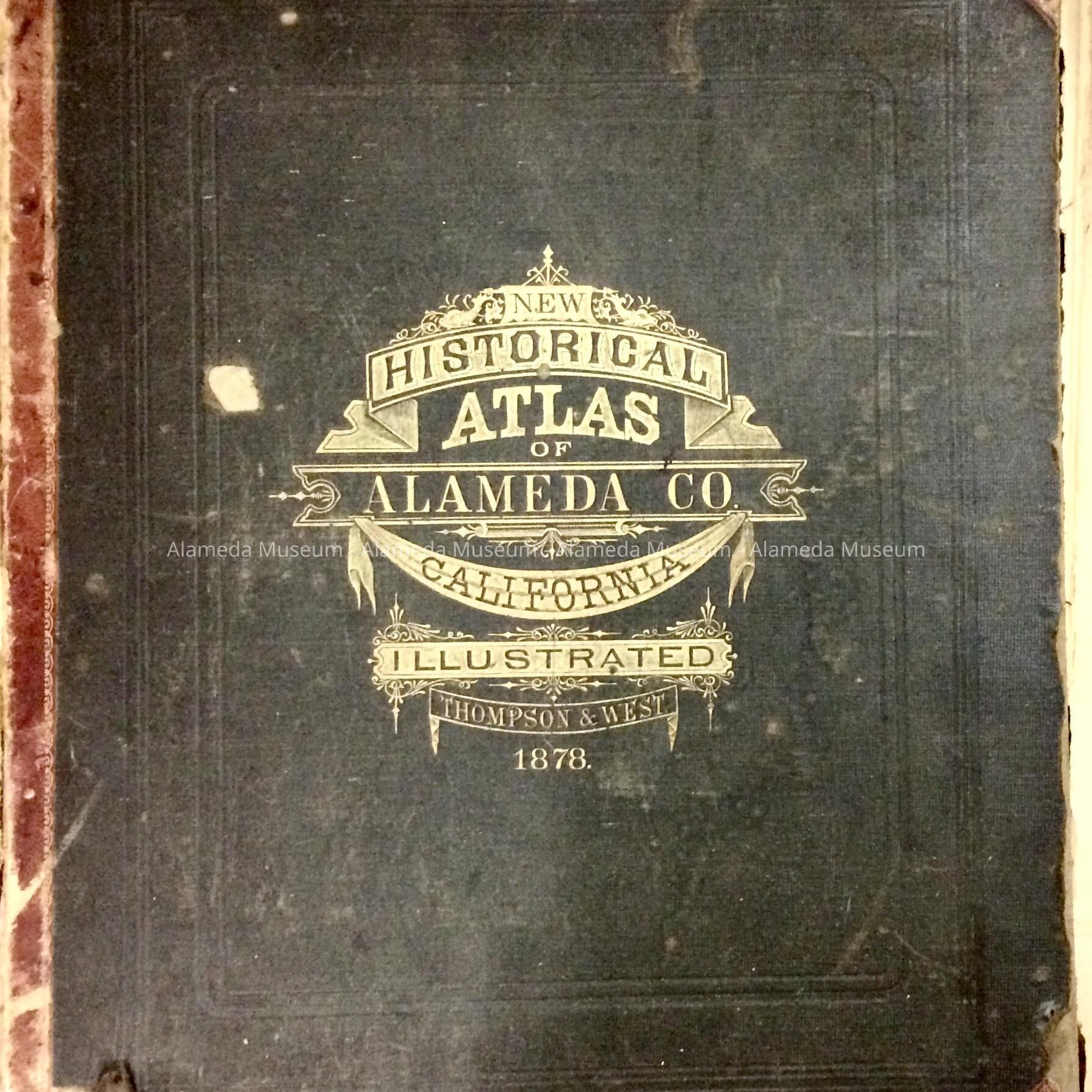 Description: Hard bound book, black colored buckram cover with incised gold lettering (cover caption) stating "New Historical Atlas of Alameda Co., California, Illustrated, Thompson & West, 1878." 170 pages. Spine of wine-red leather-look buckram with gold curlicues. Title page missing.