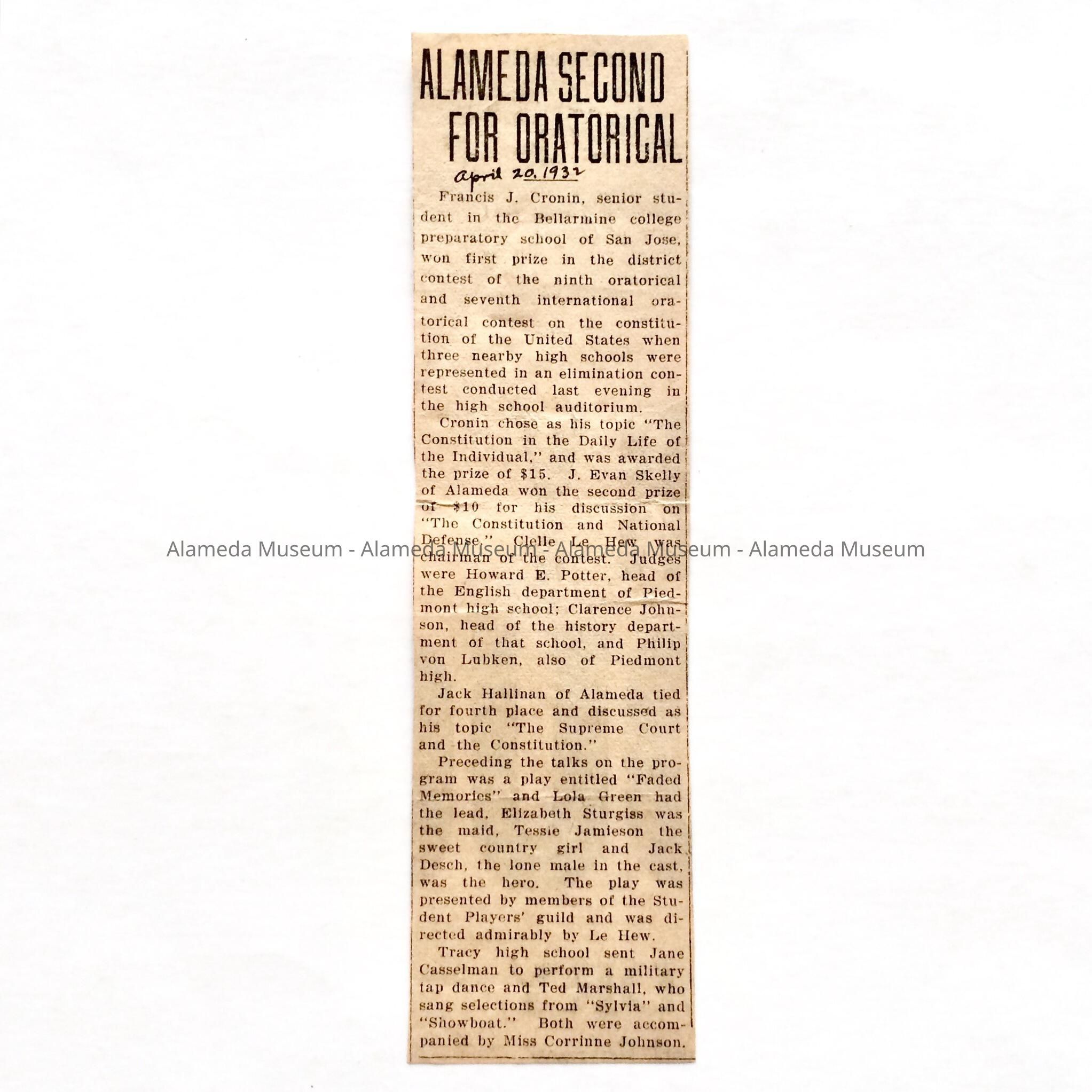 Newpaper Clipping, Alameda second for oratorical, 1932Entry/Object ID