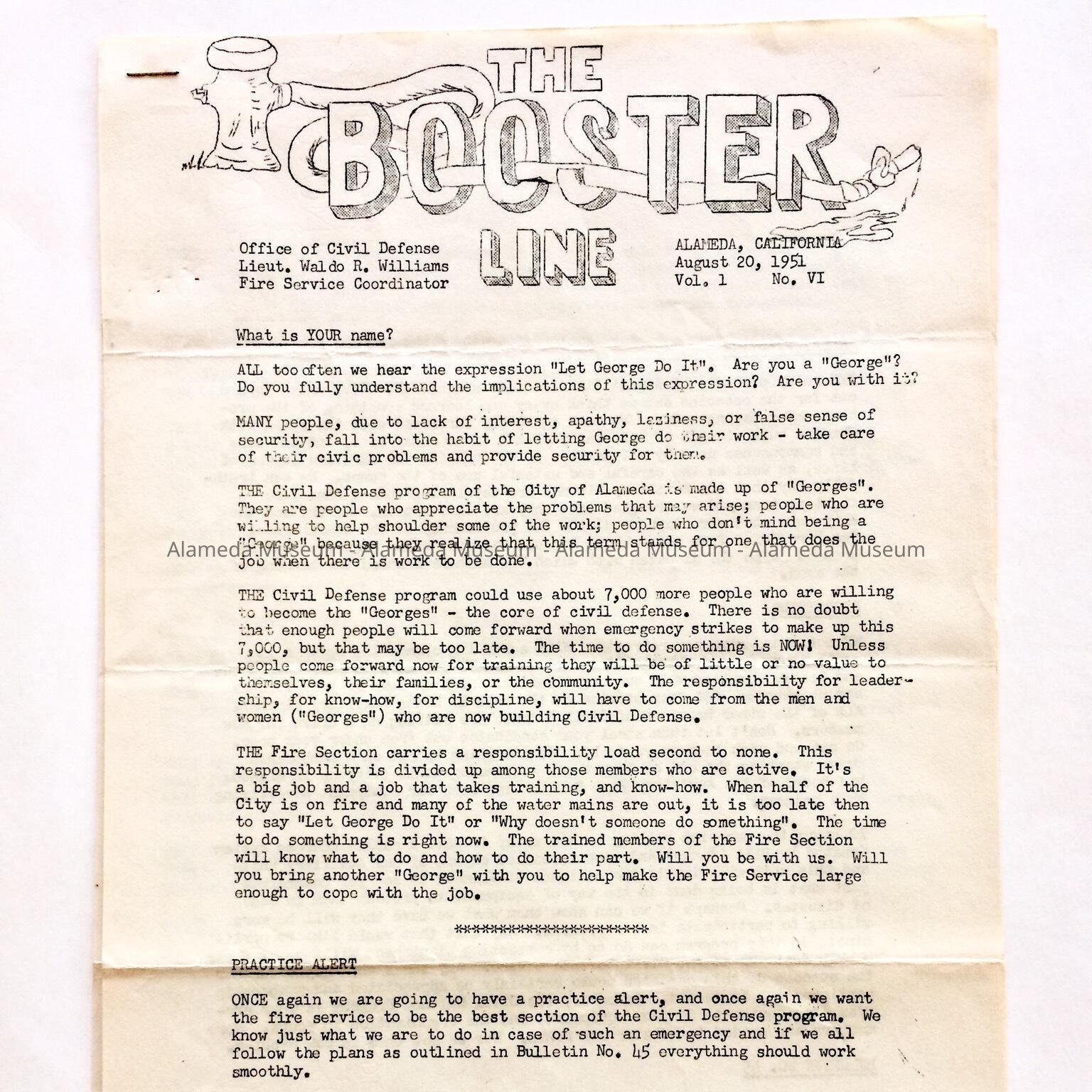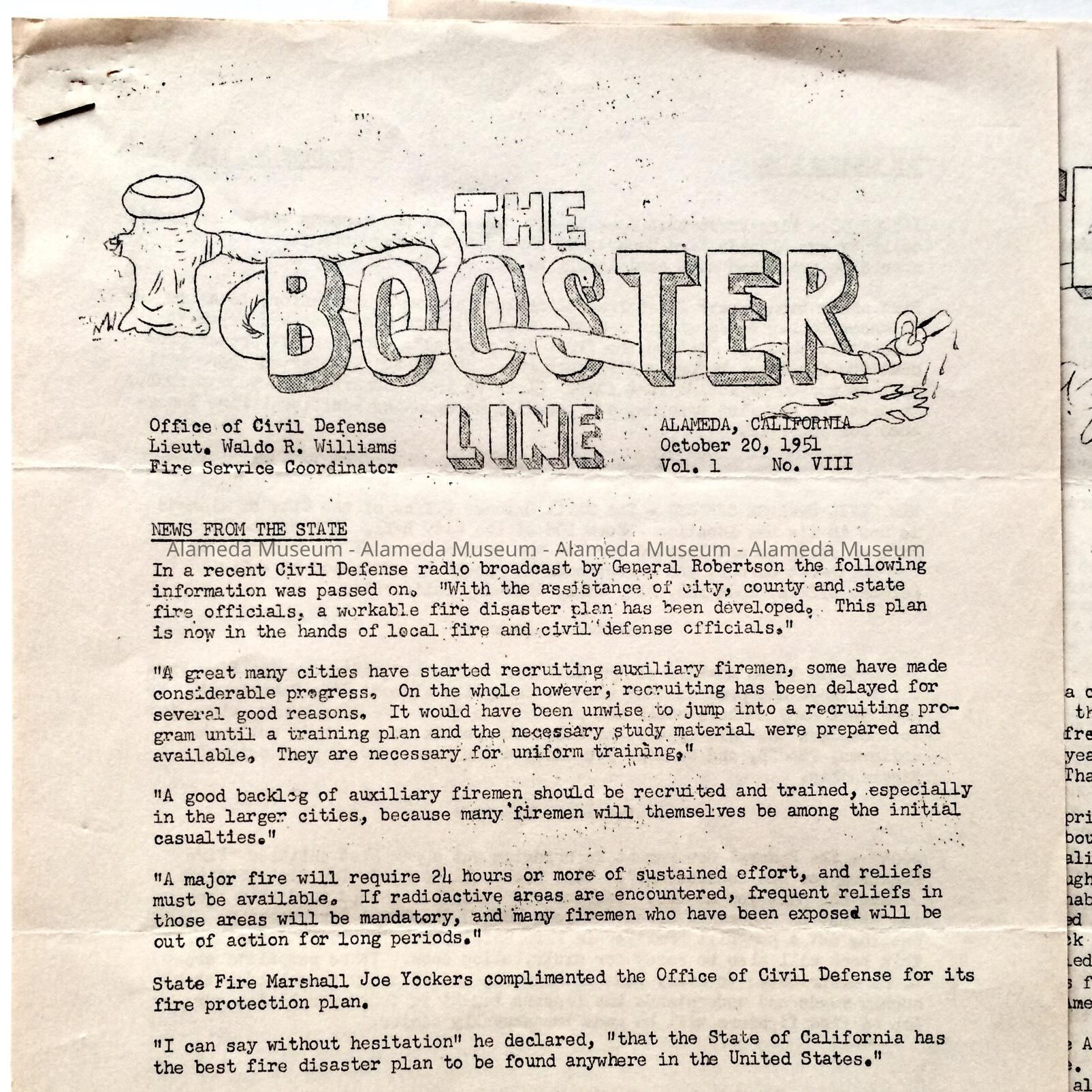 PUBLICATIONS ENTITLED, "THE BOOSTER LINE," ISSUED BY THE OFFICE OF CIVIL DEFENSE THROUGH THE ALAMEDA FIRE DEPARTMENT, CONCERNING DUTIES, REGULATIONS, ETC. OF THE ORGANIZATION.