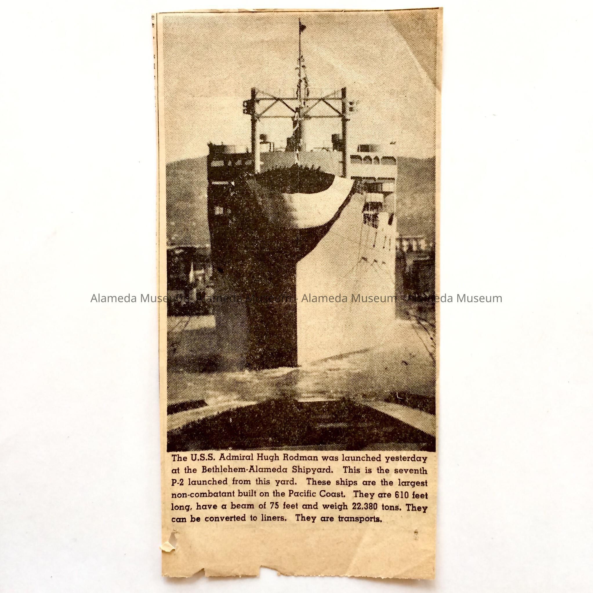 Newspaper cipping of launching of USS Admiral Hugh Rodman, 1945Entry/Object ID