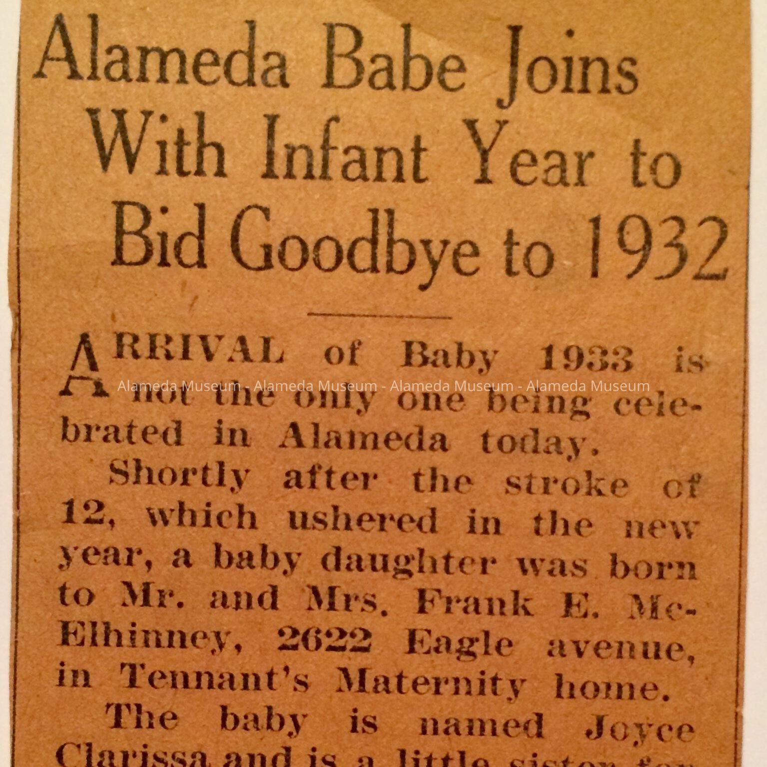 History of Object: Newspaper clipping in reference to birth of child, new year 1933, Tennant's Maternity Hospital, 1716 Chestnut St, Alameda.