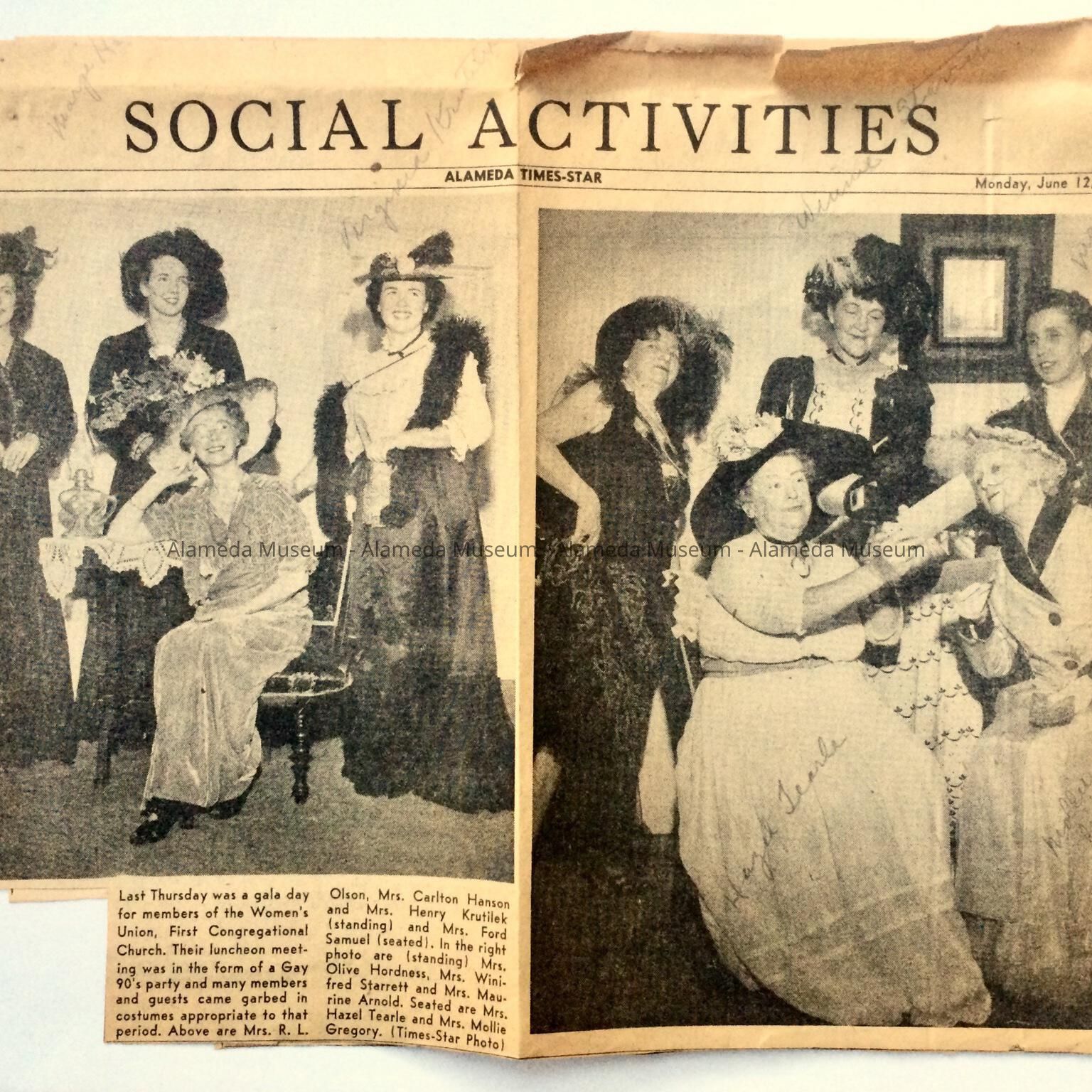 ILLUSTRATED NEWSPAPER CLIPPING OF A FASHION SHOW HELD BY THE WOMEN'S UNION, FIRST CONGREGATIONAL CHURCH, ALAMEDA, CA. THE CLIPPING ILLUSTRATES COSTUMES WORN BY MEMBERS DURING A "GAY 90'8" PARTY.