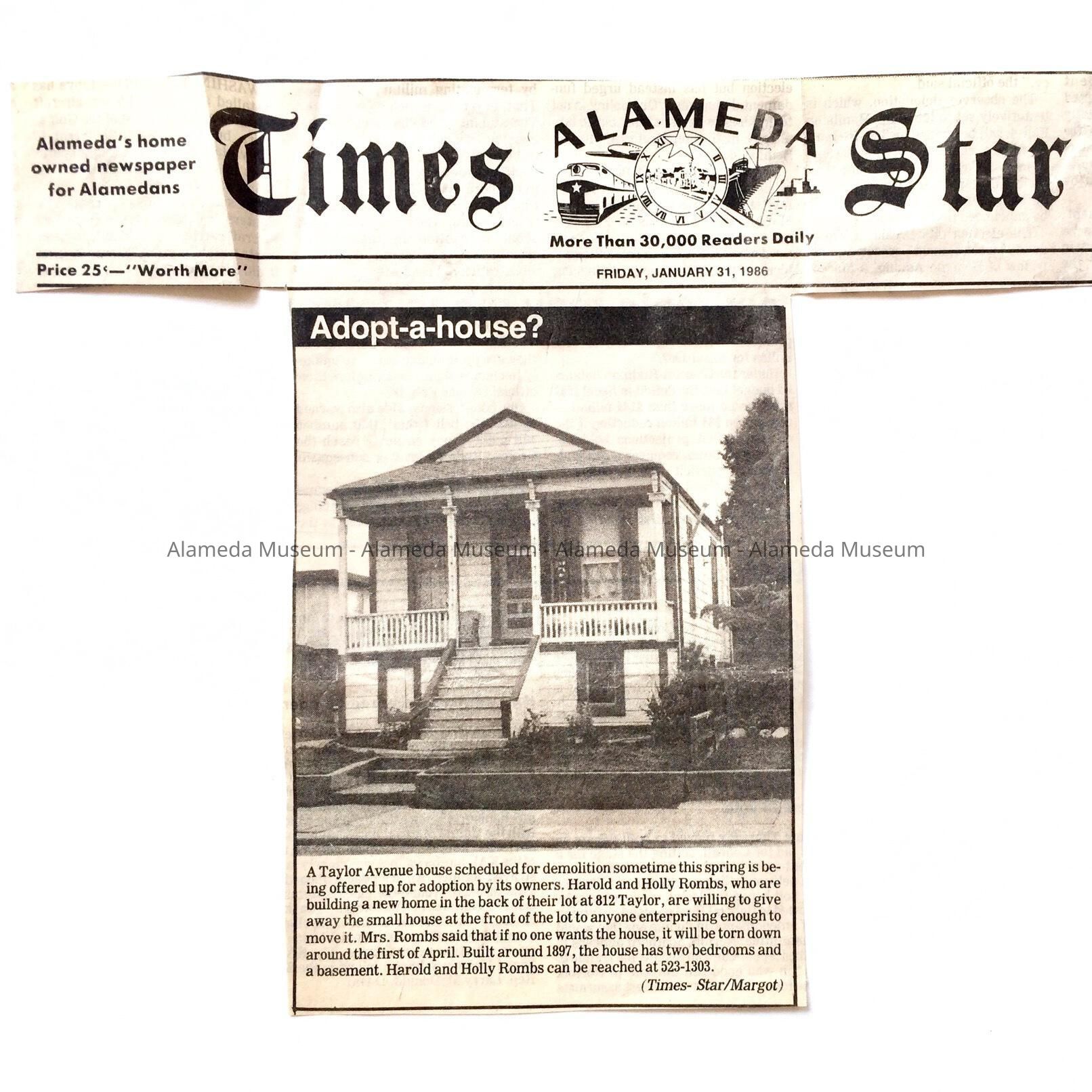 History: Newspaper clipping concerning the possible demolition or removal of 812 Taylor Avenue, a Victorian high basement cottage.