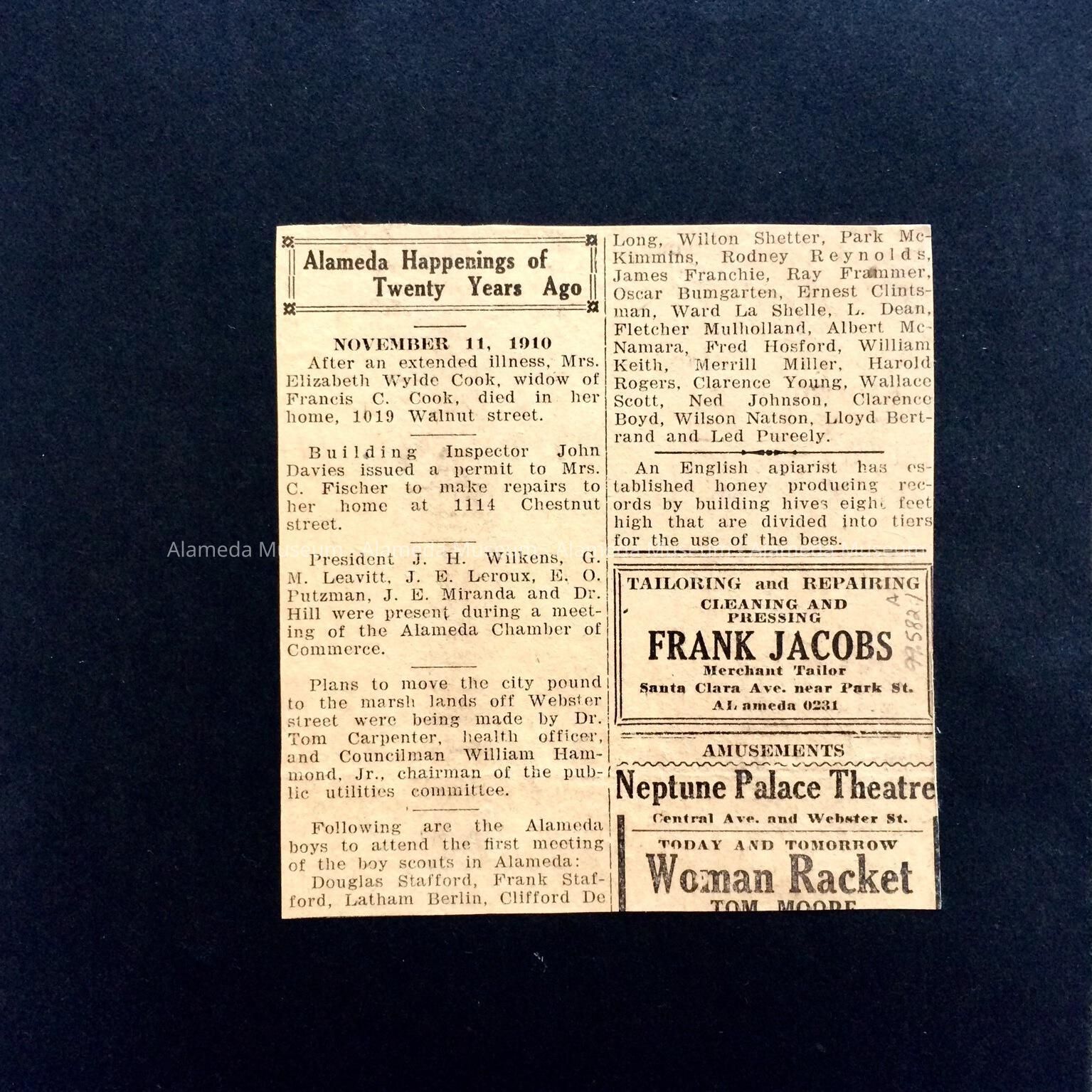 Description: Newspaper clipping with heading "Alameda Happenings of Twenty Years Ago," glued to a black colored page removed from a photo album.