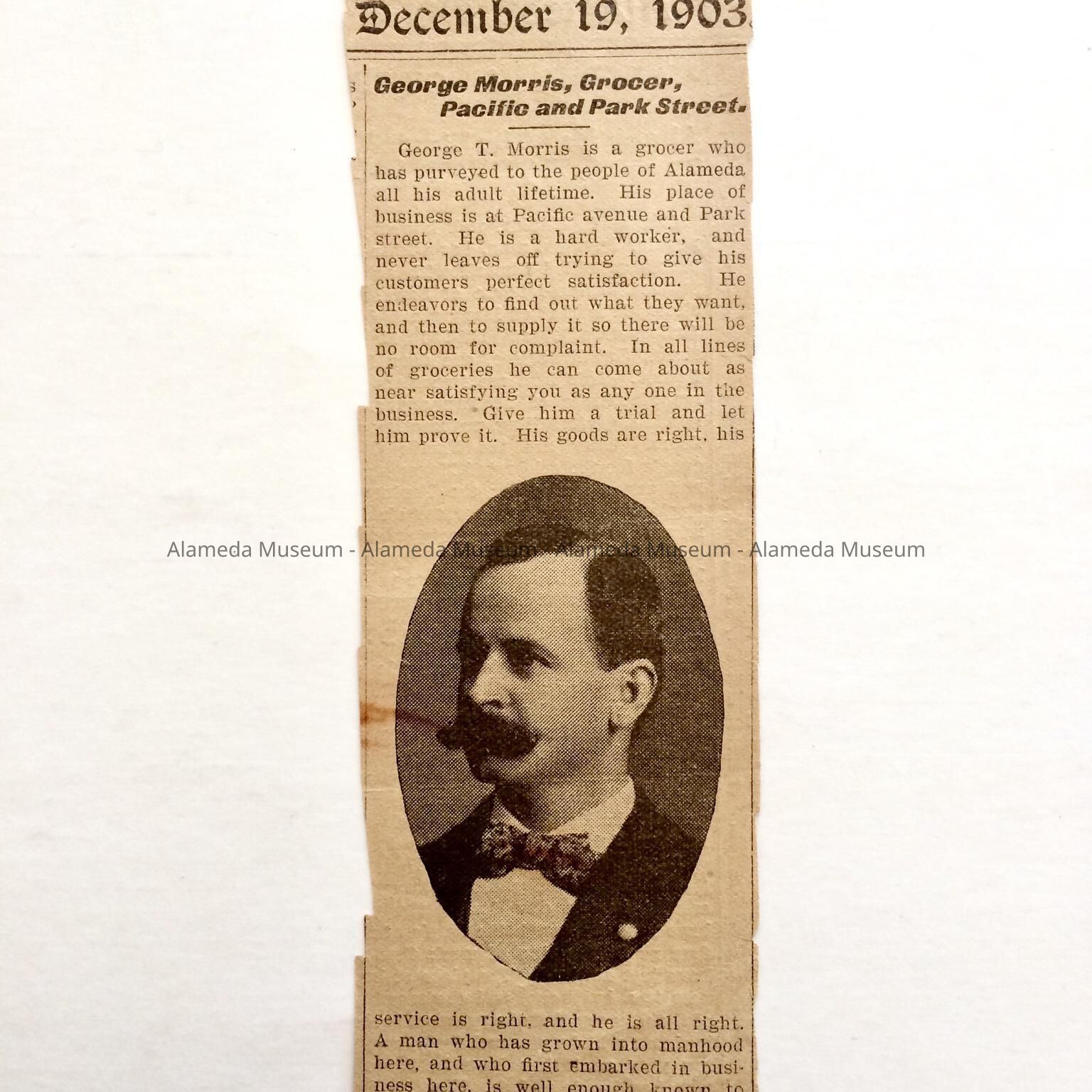 NEWSPAPER CLIPPING, WITH PORTRAIT OF GEORGE T MORRIS, AND AN ARTICLE CONCERNING HIS GROCERY STORE LOCATED AT PACIFIC AVENUE AND PARK STREET, ALAMEDA, CALIFORNIA.
