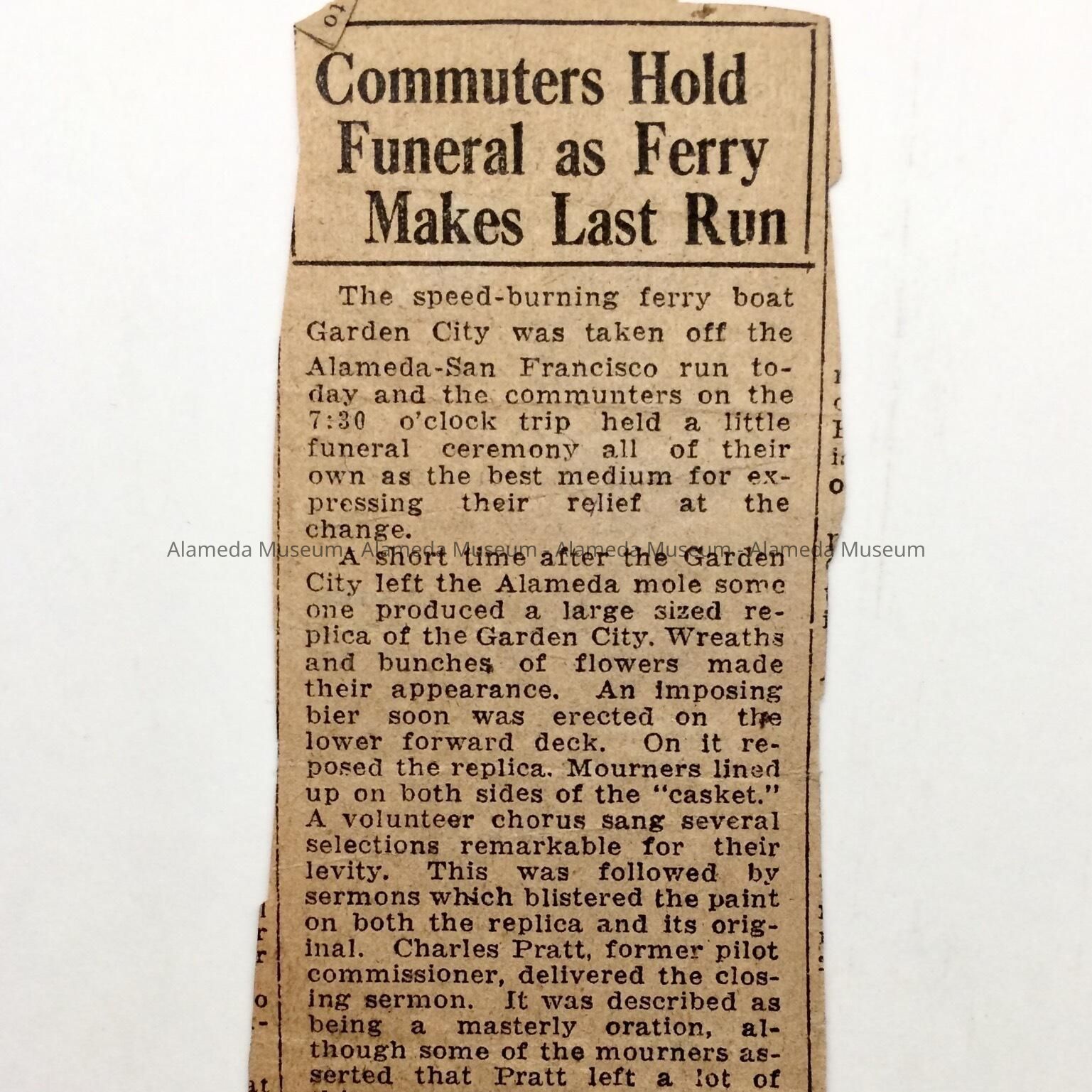 History of Object: Newspaper clipping concerning the mock funeral services that took place aboard the ferry boat Garden City, which occurred in 1939. A replica of the Garden City (now in the Alameda Historical Museum) was thrown overboard by men dressed in mourning and wearing top hats.