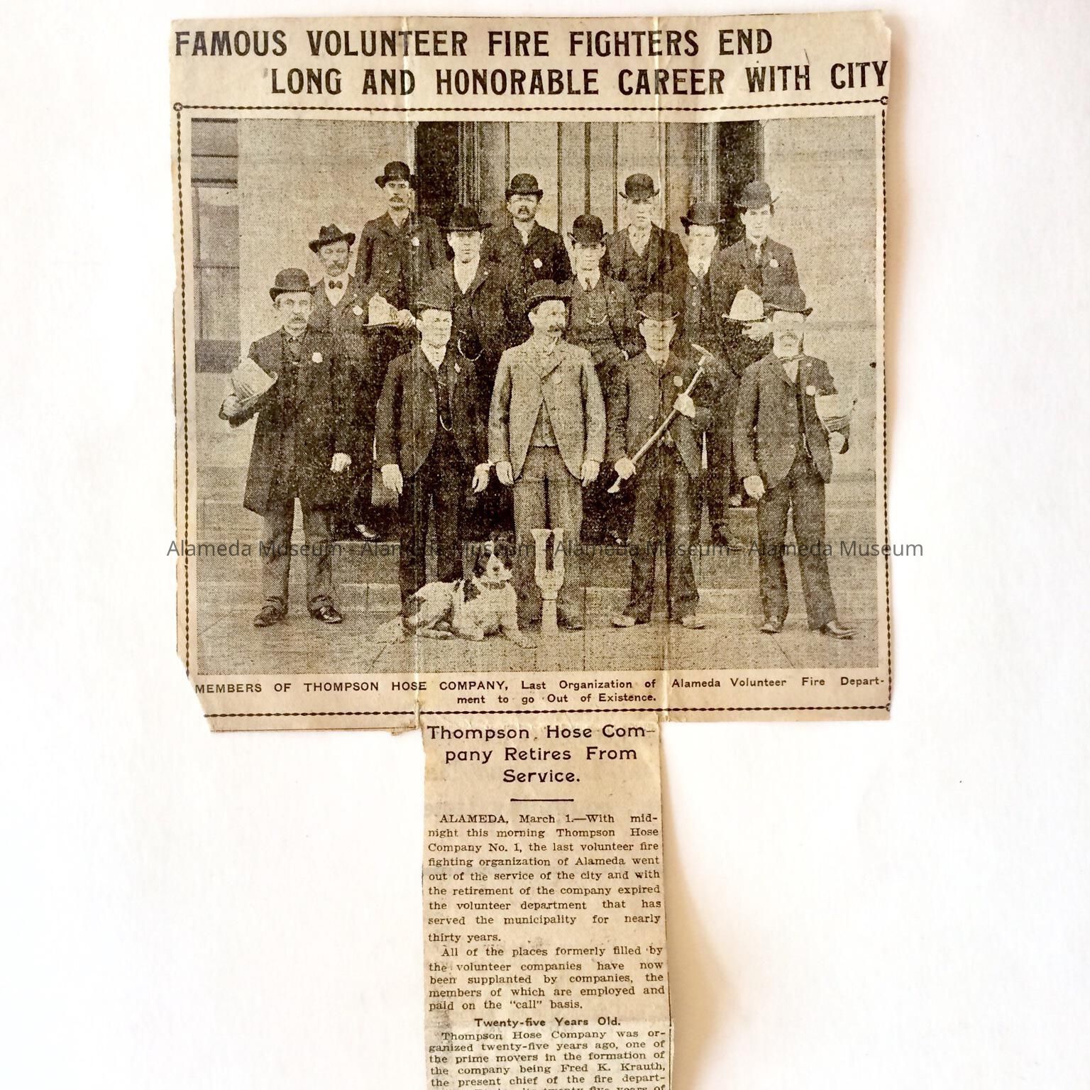 Newspaper clipping concerning the retirement of the Thompson Hose Company No. 1, the last volunteer fire fighting organization of Alameda. The clipping is dated March 1, 1905. The donor's father (John F. Hanson) and two uncles (Peter J. & Thomas R. Hanson) were members of the company.