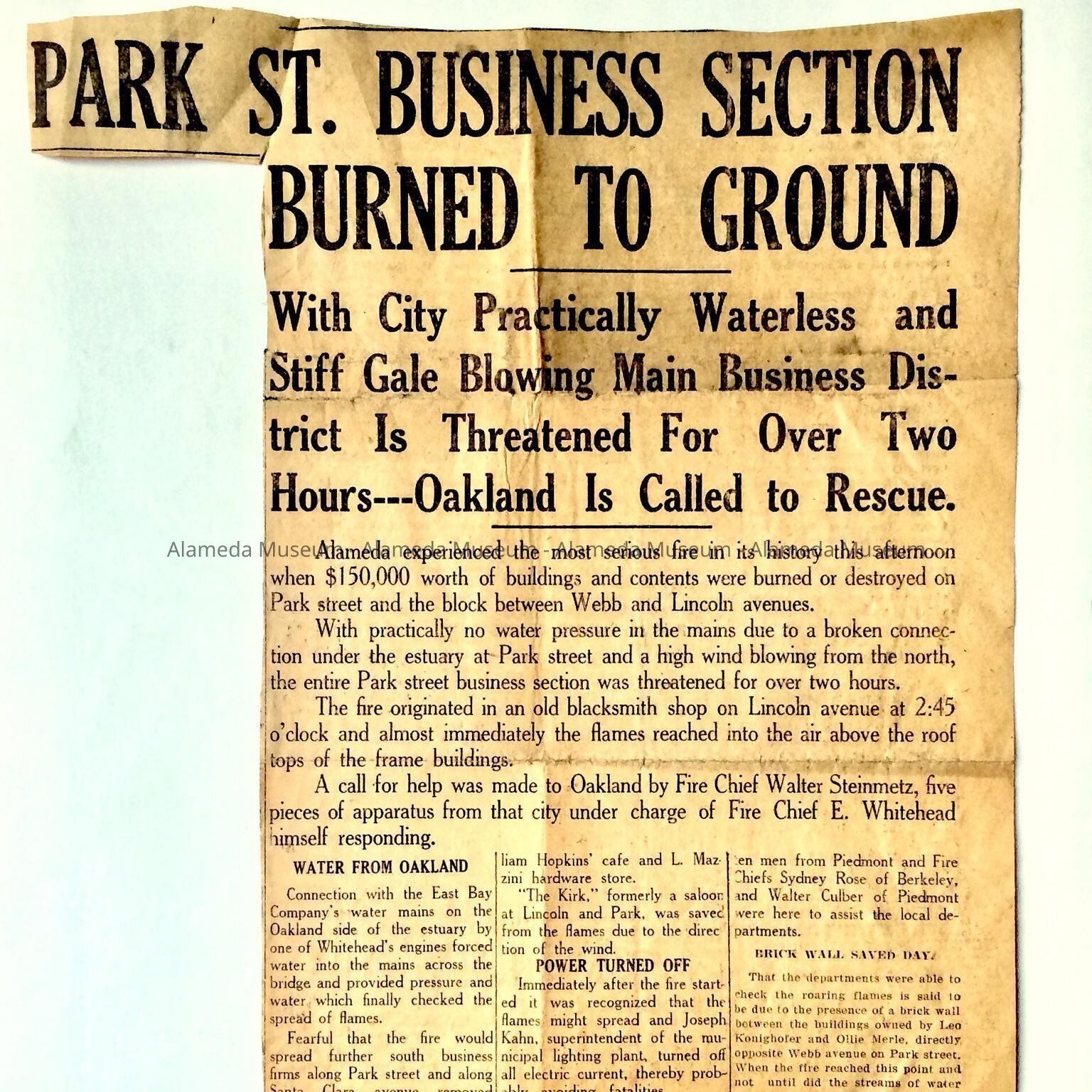 NEWSPAPER CLIPPING CONCERNING A FIRE THAT OCCURRED ON PARK STREET, BETWEEN WEBB AND LINCOLN AVENUES, ALAMEDA. SEVERAL BUILDINGS WERE DESTROYED.