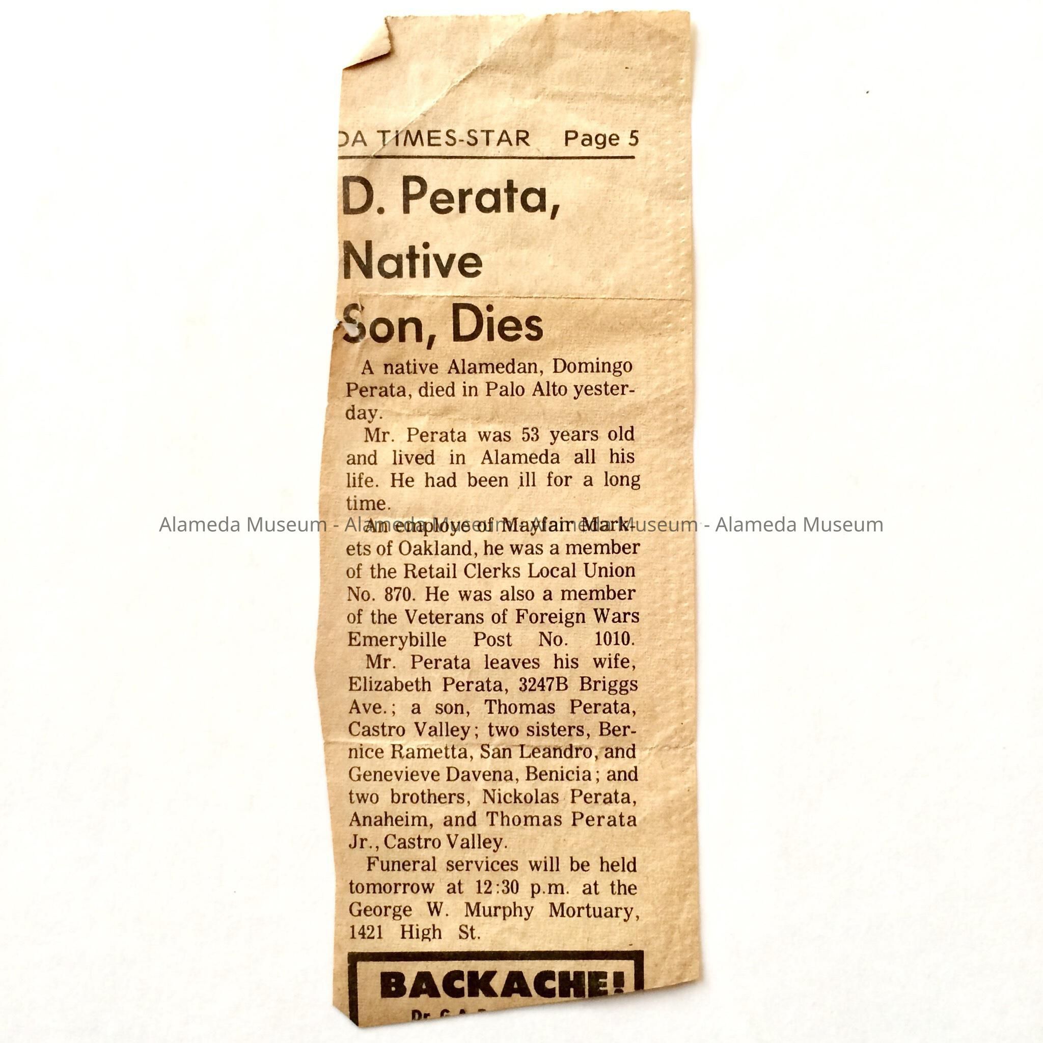 Newspaper Clipping 'D. Perata, Native Son, Died', 1965Entry/Object ID