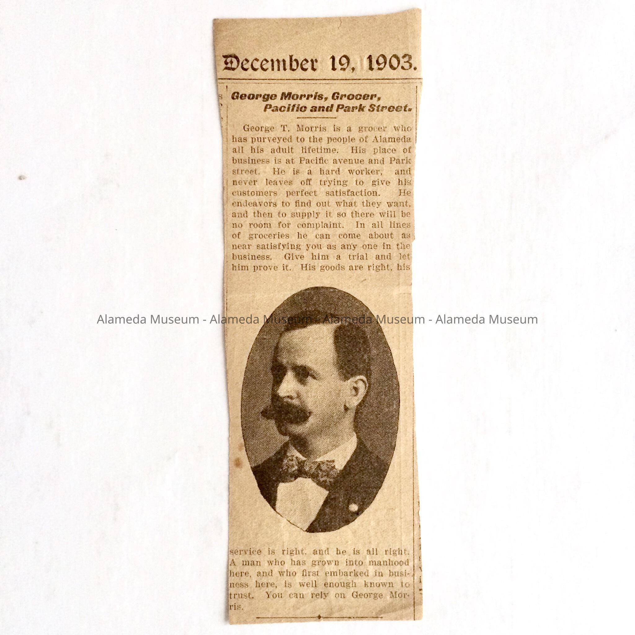 History of Object: Newspaper clipping entitled "George Morris, Grocer, Pacific and Park Street." The article states the services that Mr. Morris provides to his customers (1903). He later moved to 2048 Lincoln Avenue and operated a store there for many years.