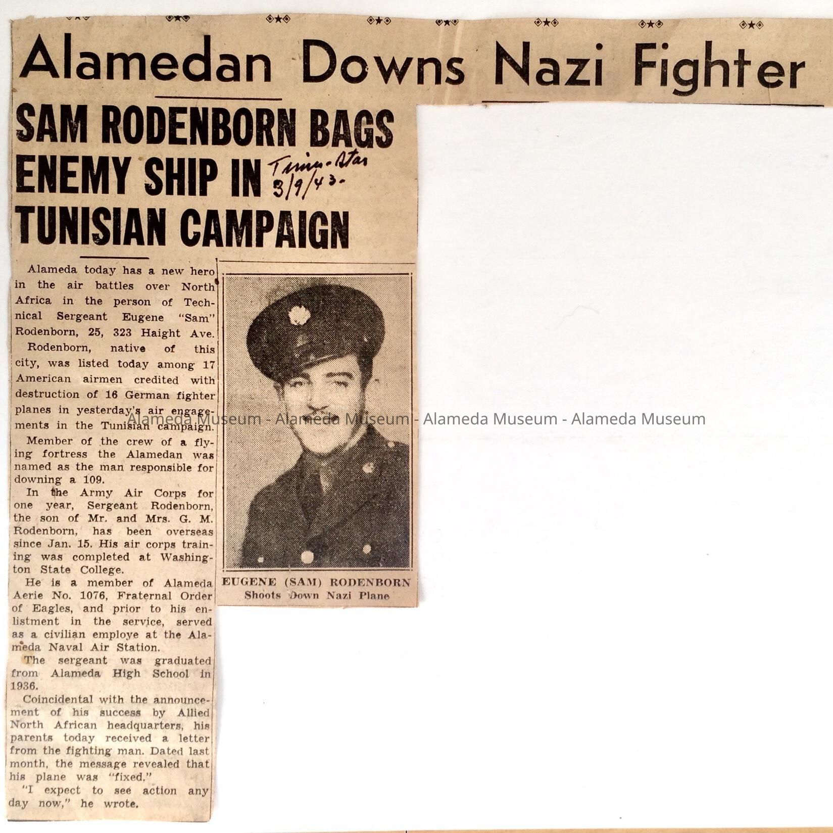 Inscribed in ink, Times-Star, 3/9/43. Bold heading "Alamedan Downs Nazi Fighter Plane".