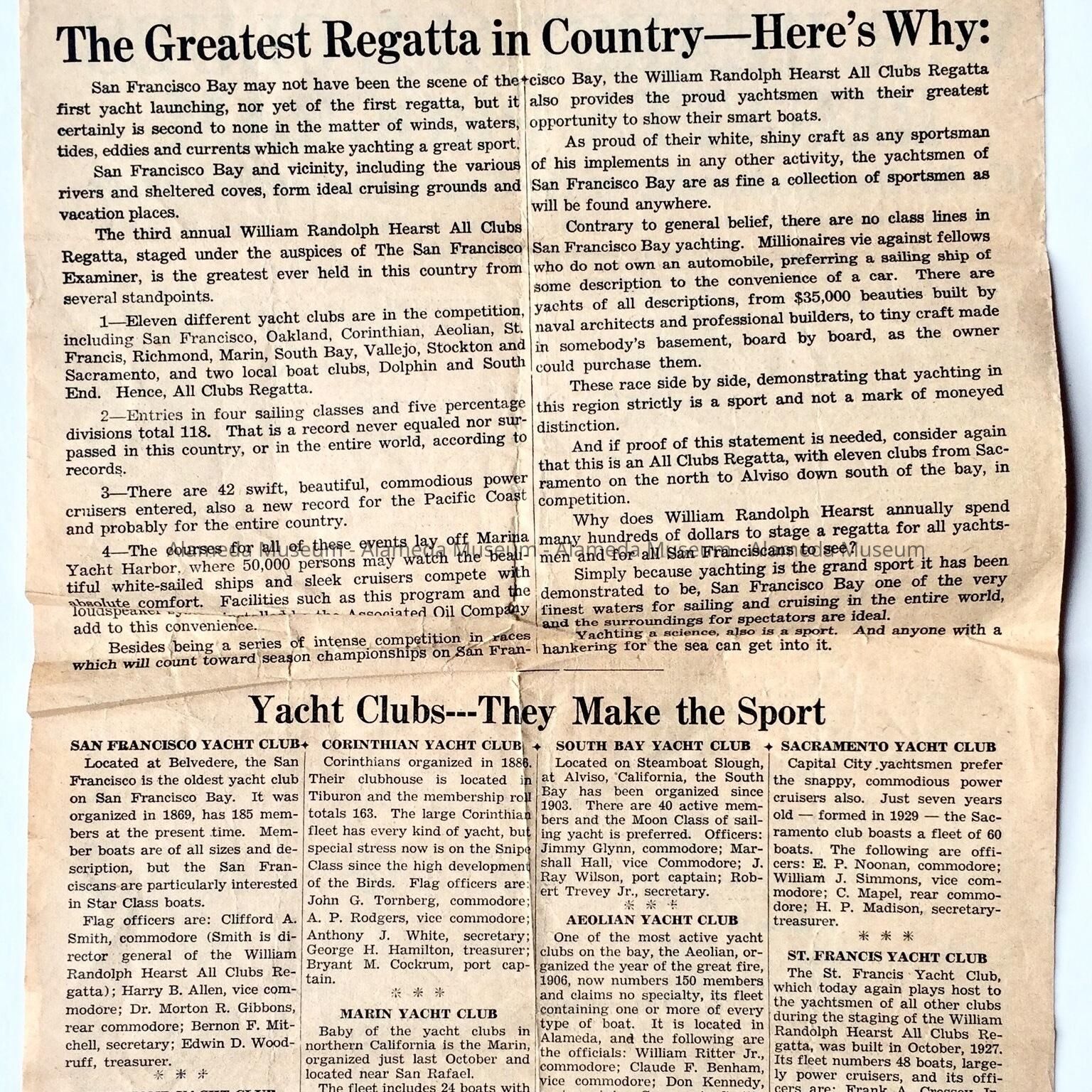 NEWSPAPER CLIPPING, LISTING VARIOUS YACHT CLUBS IN THE SAN FRANCISCO BAY AREA, AS WELL AS NAMES OF THE BOATS AND SKIPPERS PARTICIPATING IN THE W R HEARST REGATTA. ON THE REVERSE SIDE THE CLIPPING ALSO MENTIONS THE AEOLIAN CLUB PARTICIPANTS IN THE EVENT. GUSTAF EKBERG WAS AMONG THE SKIPPERS PARTICIPATING IN THE REGATTA.