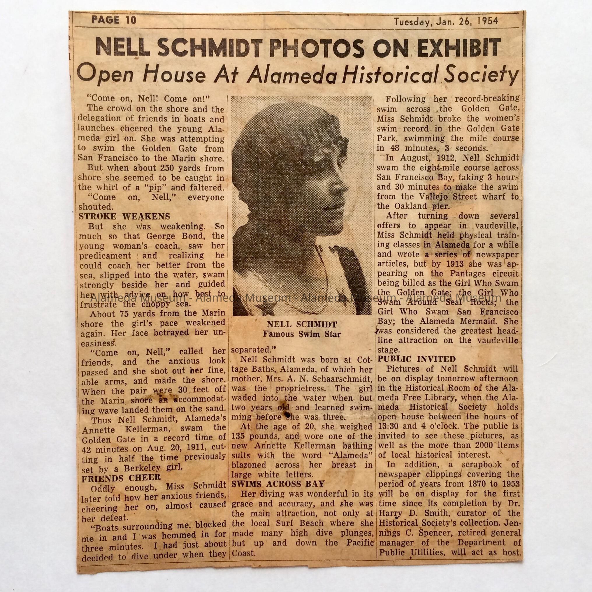 NEWSPAPER CLIPPING FROM AN UNIDENTIFIED NEWSPAPER, CONCERNING AN EXHIBIT ON THE NOTABLE SWIMMER, NELL SCHMIDT, HELD AT THE ALAMEDA HISTORICAL SOCIETY'S HISTORY ROOM IN THE BASEMENT OF THE ALAMEDA FREE LIBRARY.
