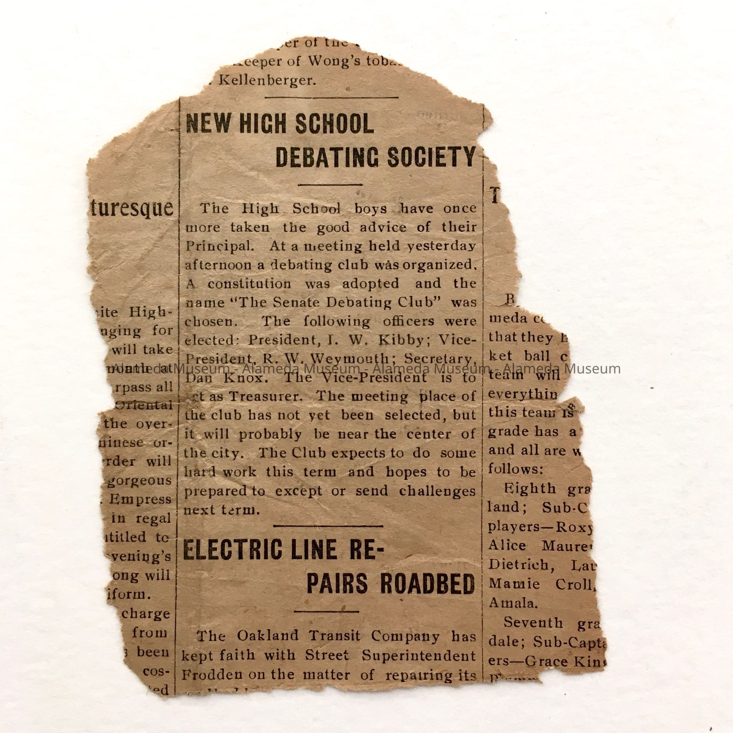 NEWSPAPER CLIPPING RELATED TO THE FOUNDING OF A CLUB CALLED "THE SENATE DEBATING CLUB, ALAMEDA HIGH SCHOOL, SECRETARY - DANIEL KNOX."