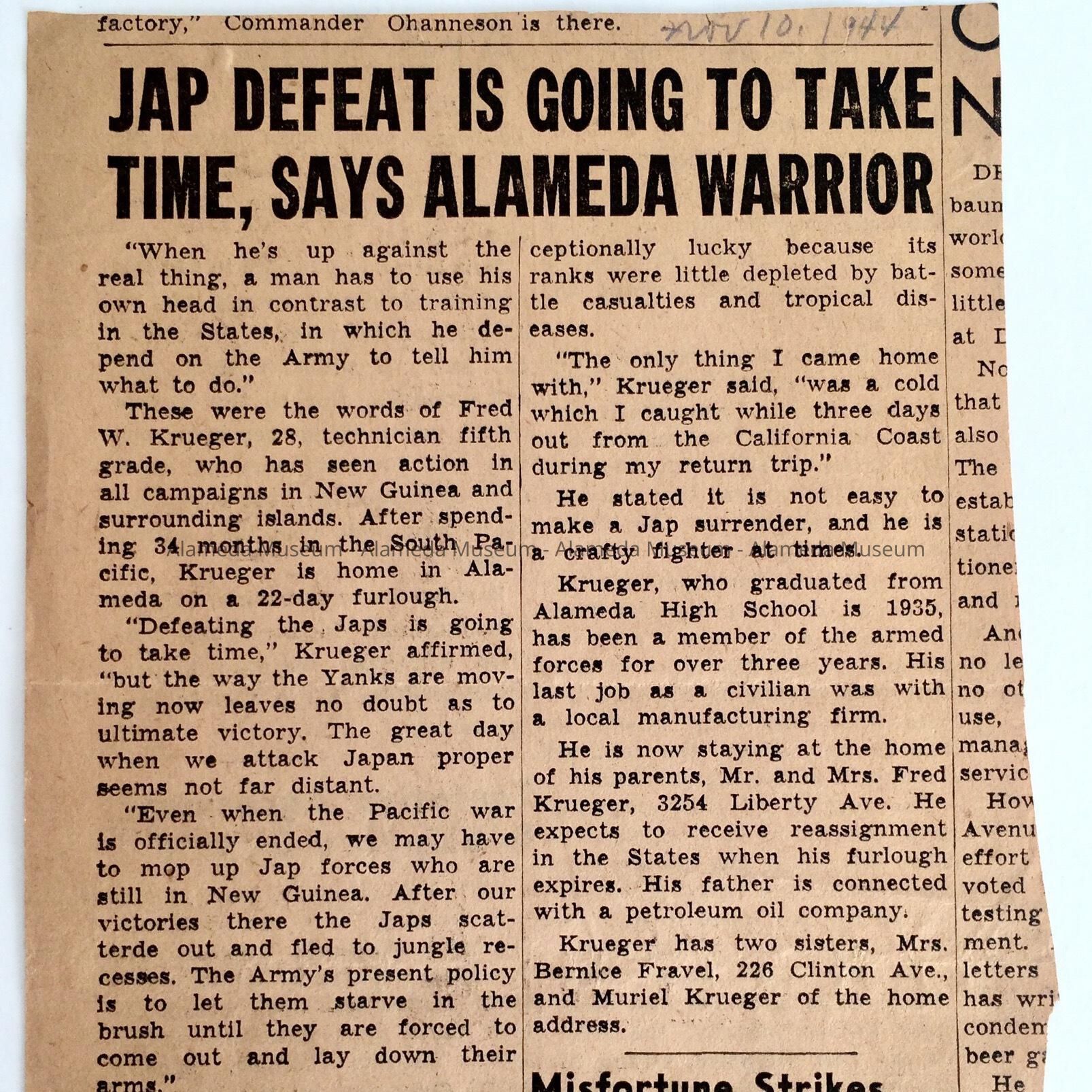 ARTICLE FROM THE NOVEMBER 10, 1944 "ALAMEDA TIMES-STAR," IN WHICH FRED W KRUEGER, FATHER OF THE DONOR, IS INTERVIEWED CONCERNING HIS EXPLOITS DURING WW-IT. MR KRUEGER, THEN 28, WAS A TECHNICIAN FIFTH GRADE, U S ARMY. HE SAW ACTION IN NEW GUINEA, AND SPENT 34 MONTHS IN THE SOUTH PACIFIC AS A MEMBER OF THE 46TH ARMY ENGINEERS WHO WORKED IN THE NEW GUINEA JUNGLES. FRED WAS A GRADUATE OF ALAMEDA HIGH SCHOOL IN 1935 AND WAS THE SON OF MR AND MRS FRED FRANK KRUEGER OF 3254 LIBERTY AVENUE, ALAMEDA.
