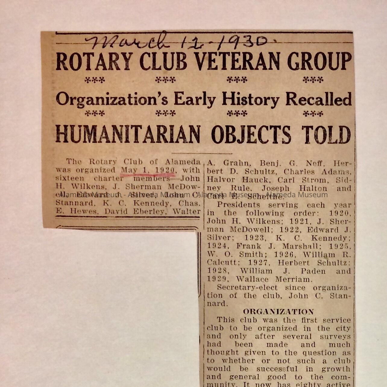 Clipping about the Rotary Club of Alameda, on its 10th anniversary, describing the founding in 1920, a list of the presidents, and some of the achievements.