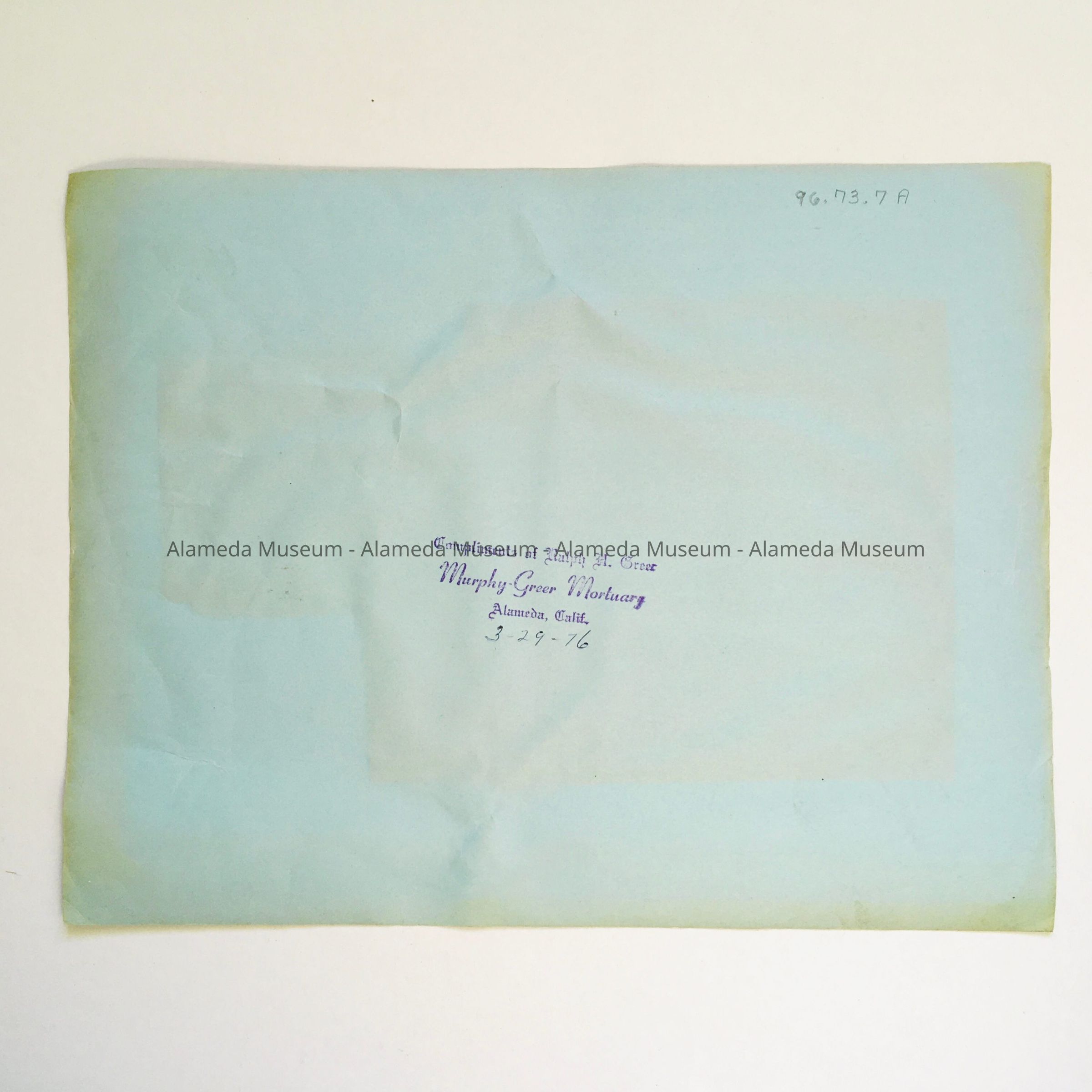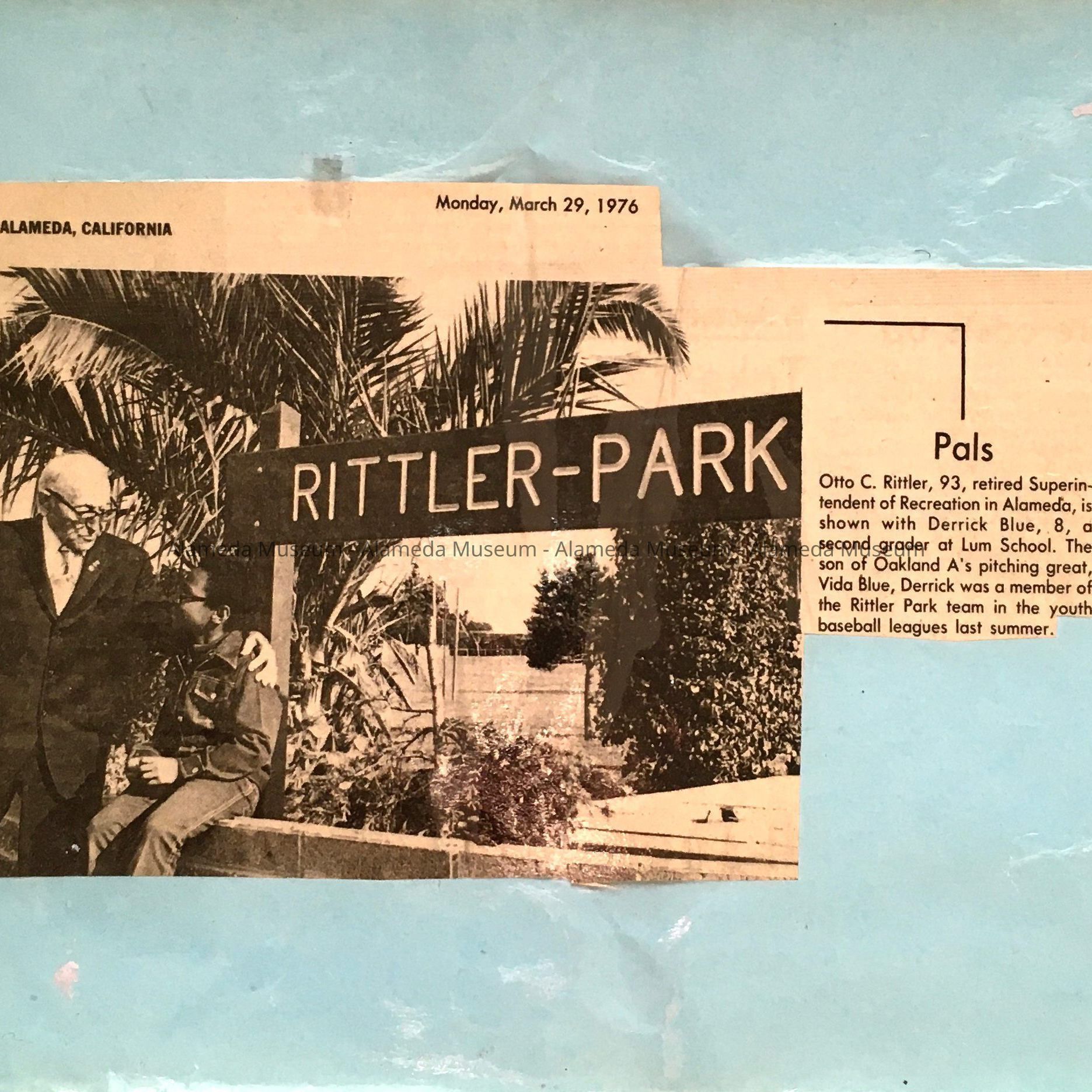 Description: Newspaper clipping, dated Monday, March 29, 1976, has been laminated onto a sheet of blue paper. A photograph shows Otto Rittler with an arm around a child (named Derrick Blue). Child is seated in front of a sign reading Rittler Park. On back is stamped Compliments of Ralph A. Greer, Murphy-Greer Mortuary, Alameda, Calif., and the date 3-29-76 written by hand. Size: 8 1/2" x 11".