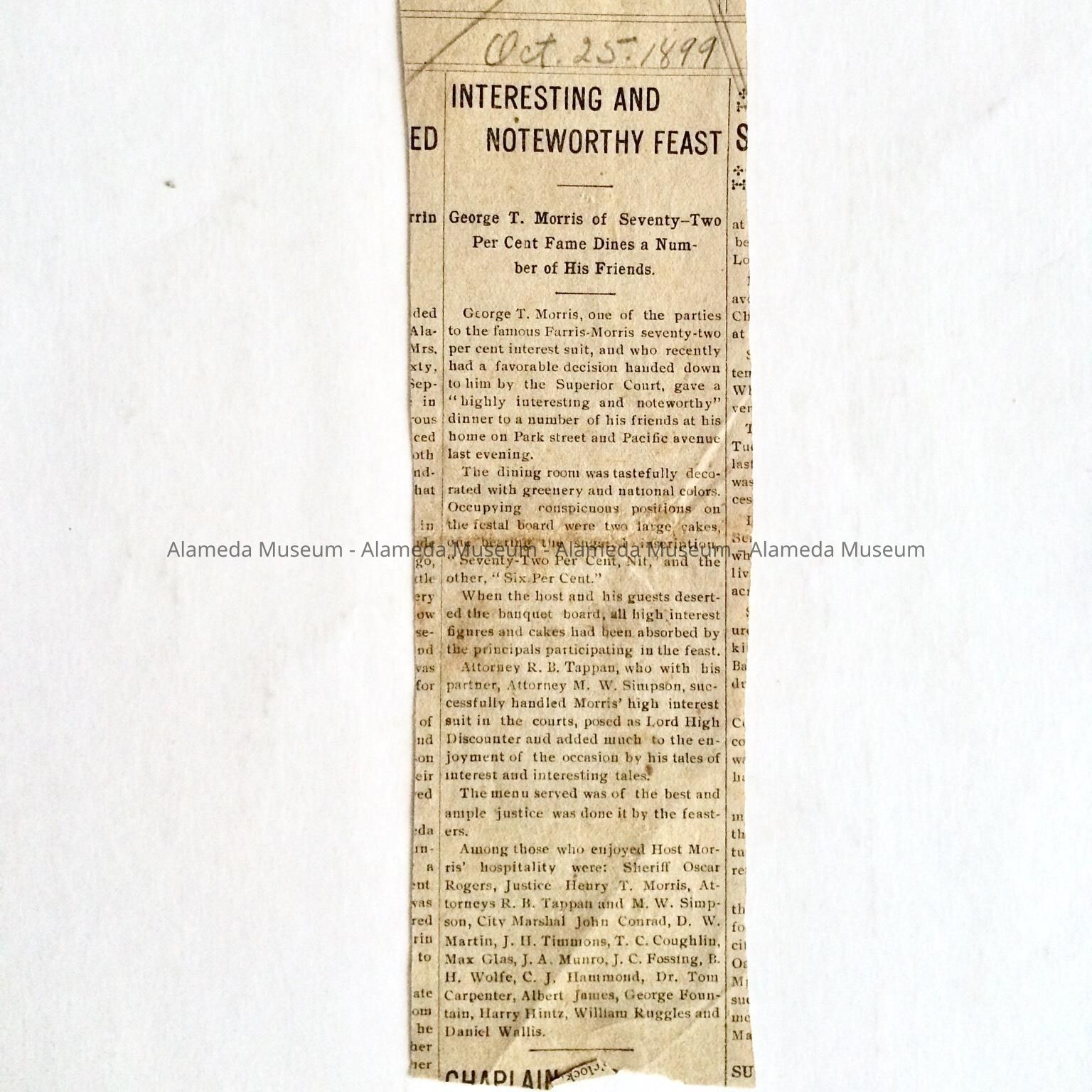 CLIPPING FROM "ENCINAL," DATED OCTOBER 25, 1899, CONCERNING A PARTY FOR MR GEORGE T MORRIS, HOSTED AT HIS HOME. ALSO INCLUDED ARE NAMES OF PARTY GUESTS. THE PARTY WAS HELD IN HIS FLAT ABOVE HIS GROCERY STORE AT PACIFIC AVENUE AND PARK STREET.
