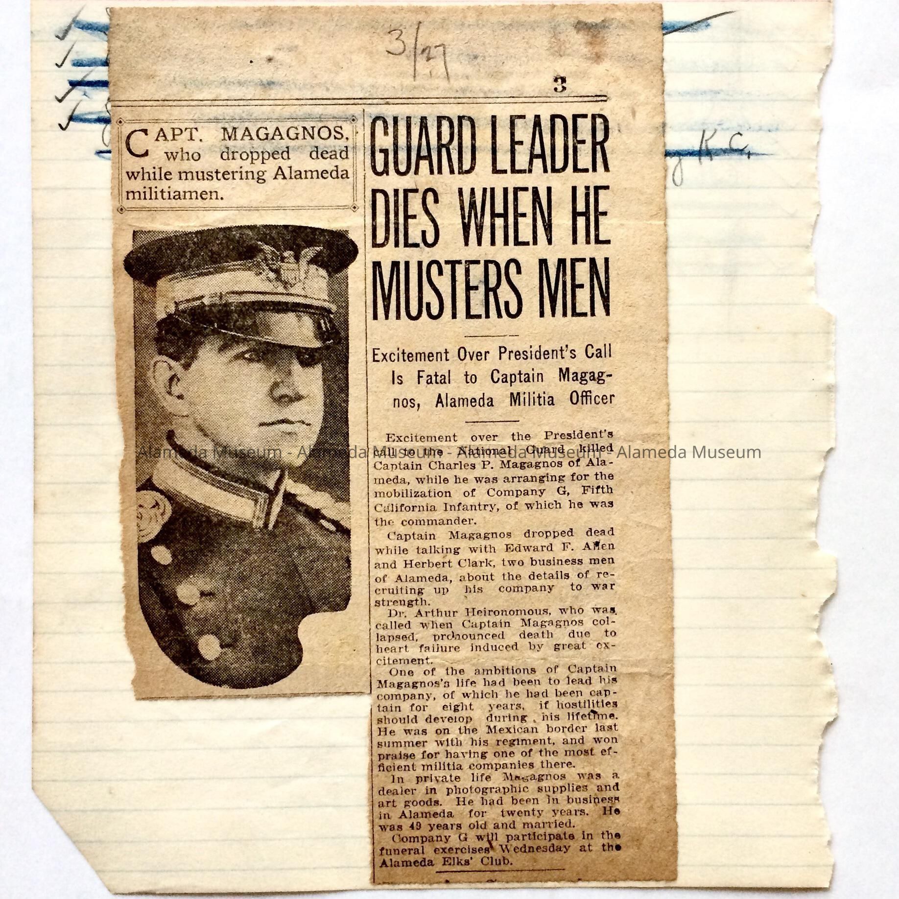 History of object: Article with heading "Guard Leader Dies When He Musters Men". Excitement over President's call is fatal to Captain Magagnos, Alameda Militia Officer. Magagnos was a dealer in photographic supplies and art goods, having a store on Park Street. He died from the results of hearing the news concerning the call up of Company G, Alameda National Guard, by the President.
