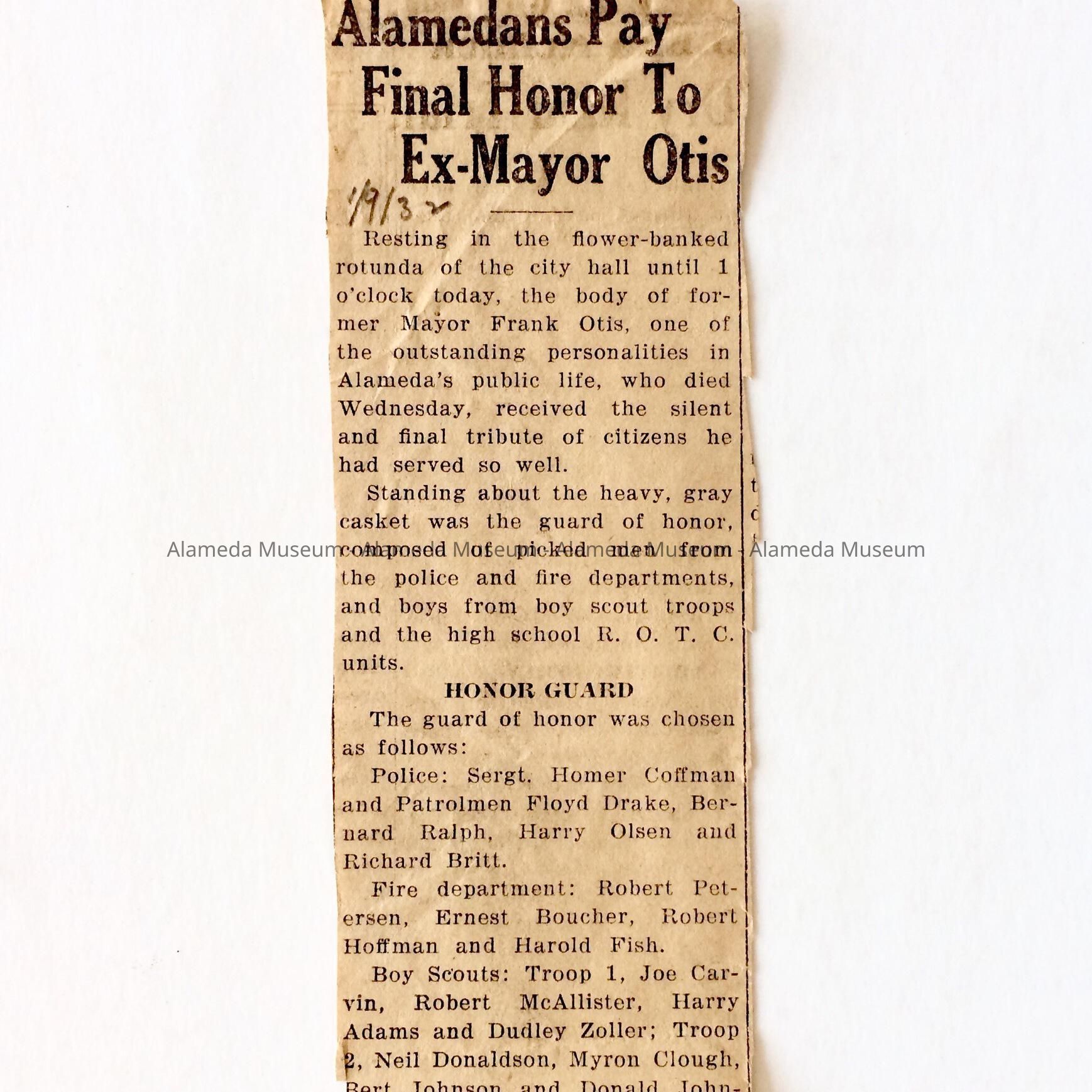 History of Object: Newspaper clipping regarding the death of ex-Mayor Frank Otis, and his remains being viewed at the Alameda City Hall.