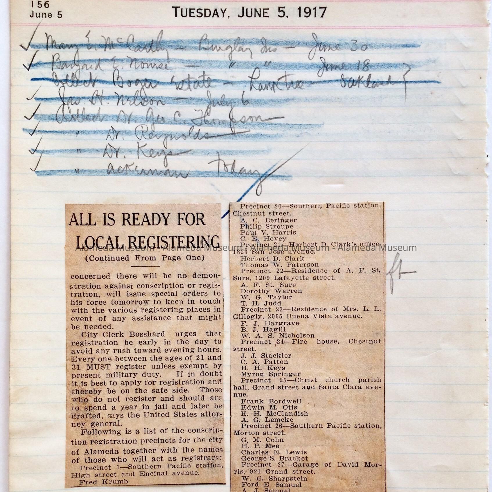 Incomplete newspaper article on registration for the draft during the first World War. It gives a list of precincts, names of registrars, and places for sign up. Precinct is Herbert D. Clark’s office, 1823 San Jose Avenue, Alameda.