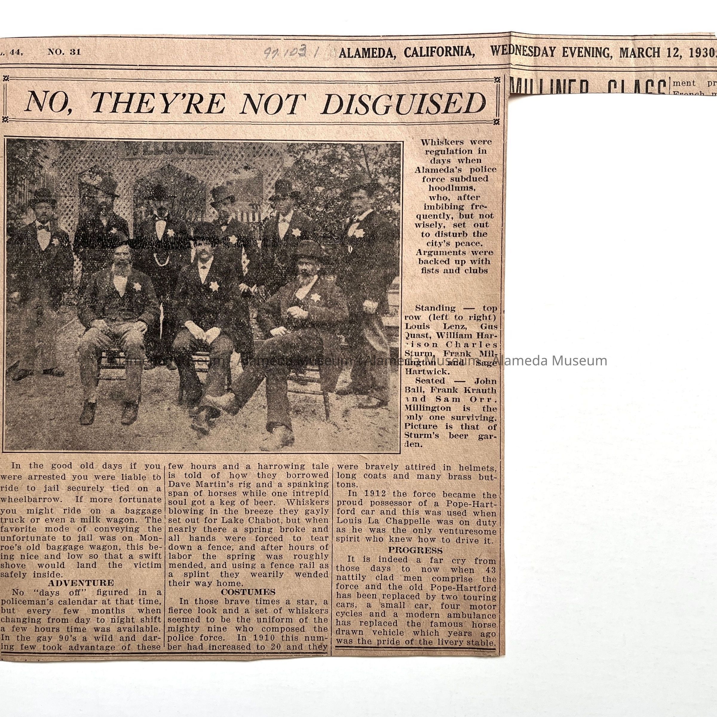Description: newspaper clipping of an article, illustrated with a copy of a 1878 photo (Acc. No. 97.67.1, 97.66.1), from an unidentified Alameda newspaper, dated March 12, 1930.