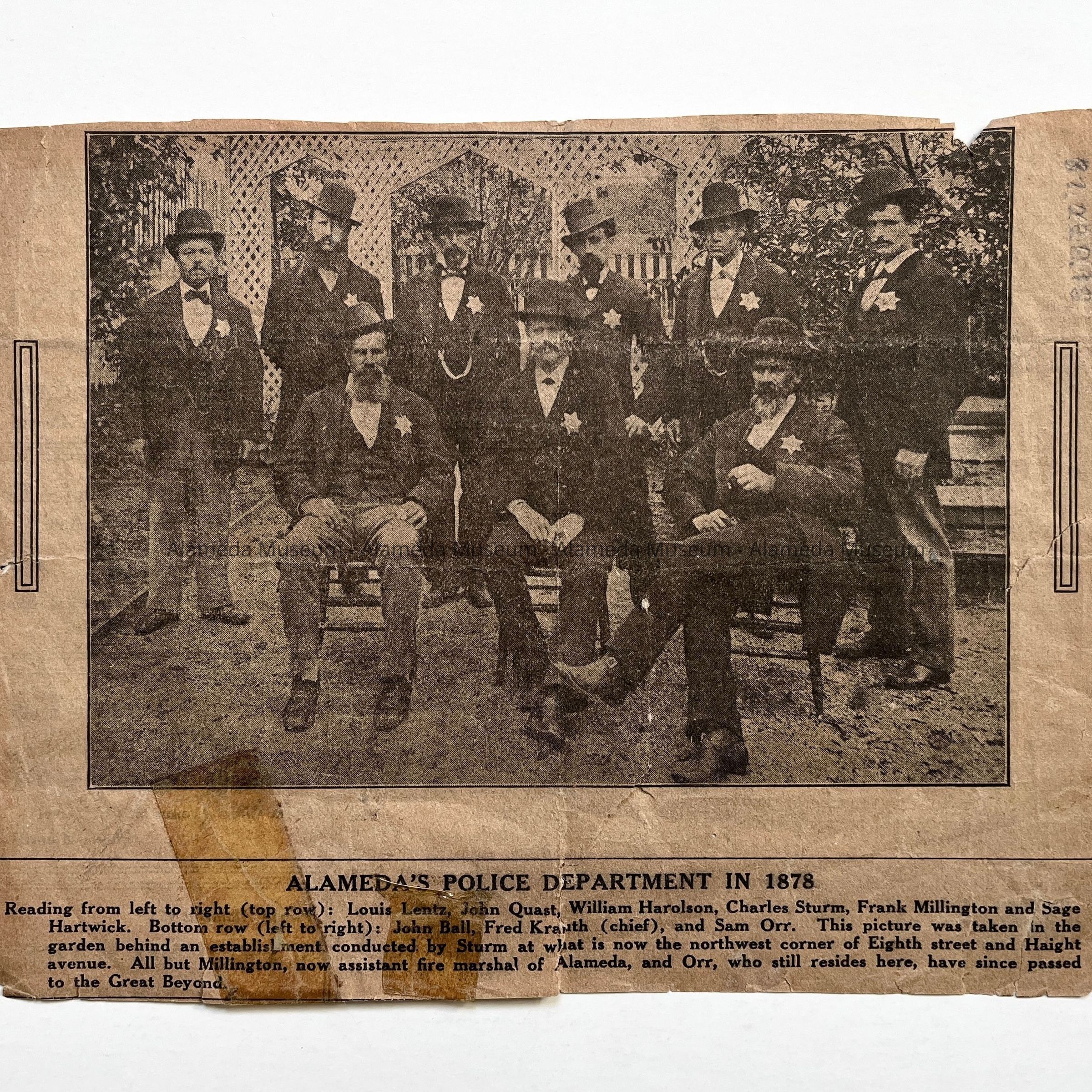 History of Object: article with reproduced photograph of the Alameda Police Force in 1878. It lists the names of the original members of the force. The Alameda Historical Society has the original photograph from which this newspaper copy was made in 1921.