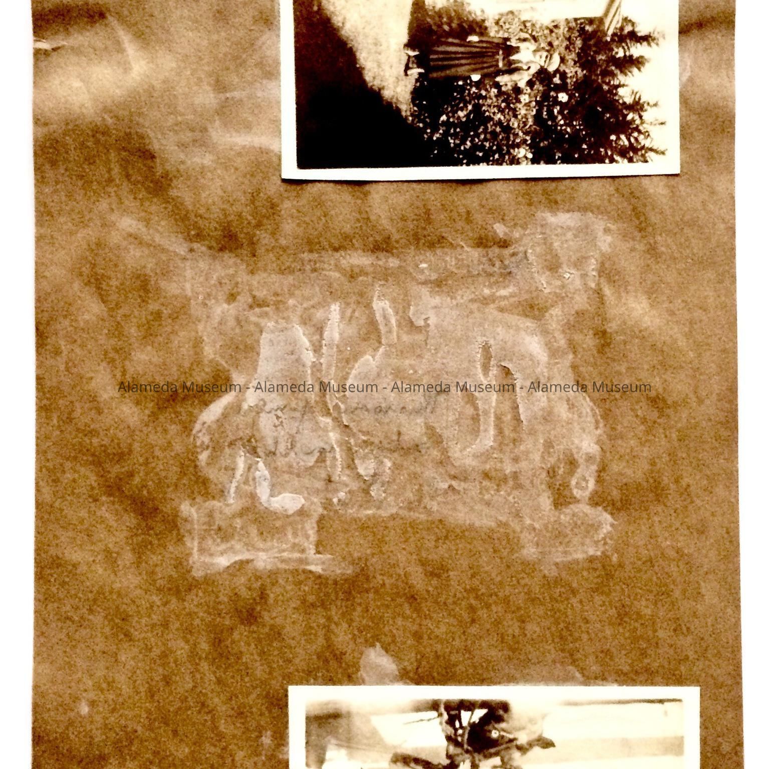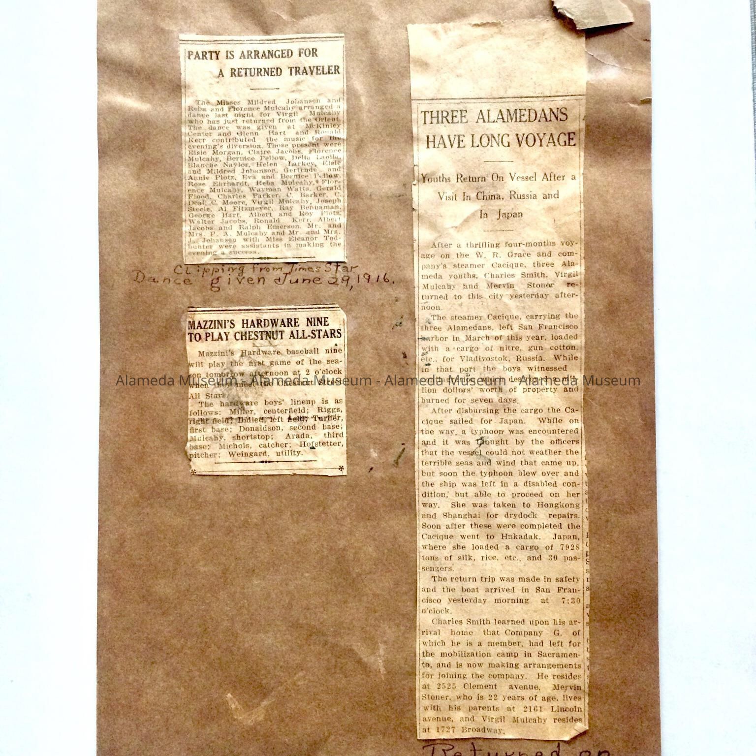 NEWSPAPER CLIPPINGS CONCERNING ACTIVITIES OF MEMBERS OF THE MULCAHY FAMILY. ONE ARTICLE CONCERNS VIRGIL MULCAHY'S TRIP BY STEAMER TO THE ORIENT. ANOTHER ONE REFERS TO A DANCE HELD IN VIRGIL'S HONOR, WHILE STILL ANOTHER ARTICLE CONCERNS AN AMATEUR BASEBALL TEAM. UNIDENTIFIED PHOTOGRAPHS APPEAR ON THE REVERSE SIDE OF THE ALBUM PAGE.
