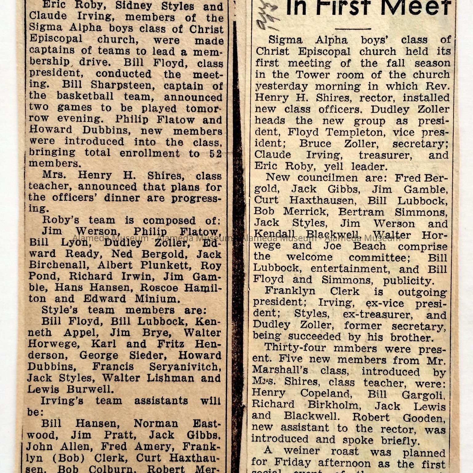TWO NEWSPAPER CLIPPINGS CONCERNING THE SIGMA ALPHA BOYS' CLASS OF CHRIST EPISCOPAL CHURCH. MEMBERSHIPS (NAMES) ARE INCLUDED.