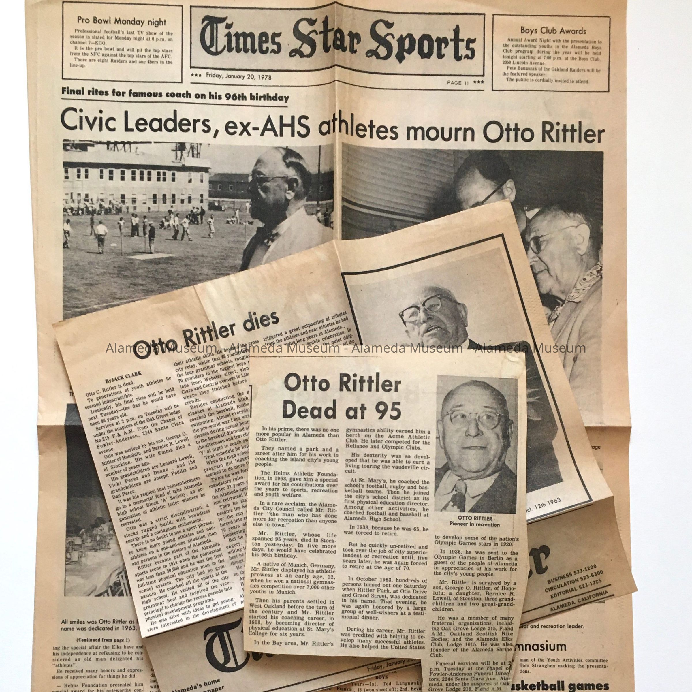 96.73.31B: Page from Alameda Times Star with banner at top Times Star Sports, dated Friday, January 20, 1978, page 11, and headlines Civic Leaders, ex-AHS Athletes Mourn Otto Rittler. Article includes three photographs of Otto Rittler and one of Rittler Park.