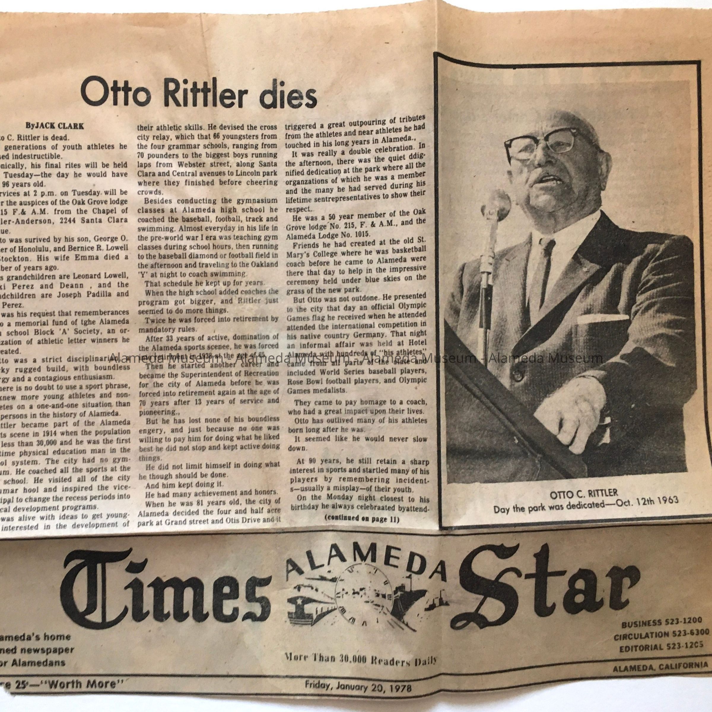 96.73.31 C: Clipping from Alameda Times Star, dated Friday, Jan. 20, 1978, with photograph of Rittler captioned Otto C. Rittler Day the Park was Dedicated - Oct. 12, 1963. Article is entitled "Otto Rittler Dies" and is written by Jack Clark.