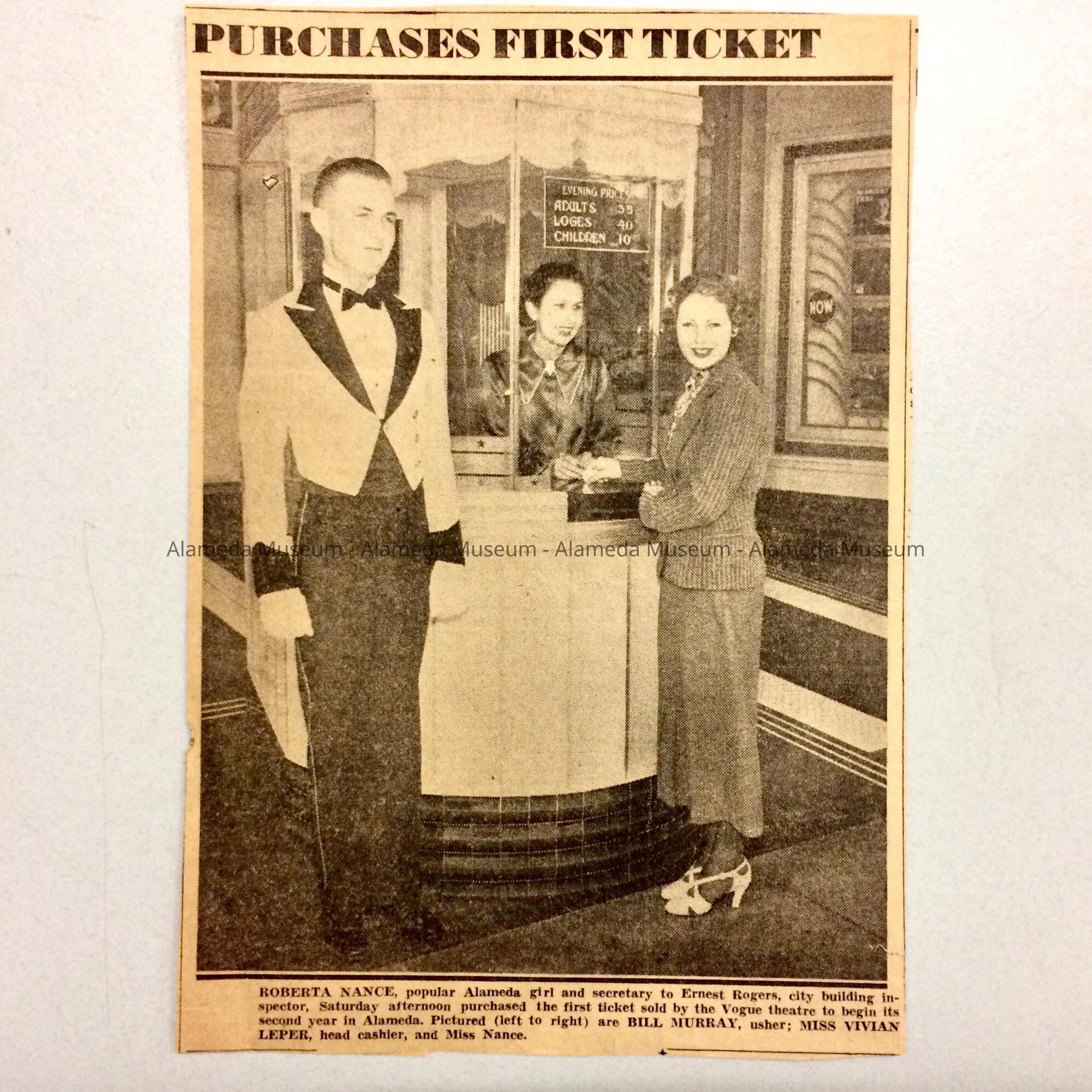 History of Object: Photograph of Roberta Nance, secretary to Ernest Rogers, city building inspector, purchasing first ticket sold by the Vogue theatre in its second year of operation in Alameda. Bill Murray (son of Mayor Murray), usher, and Ms. Vivian Leper, head cashier, are also pictured.