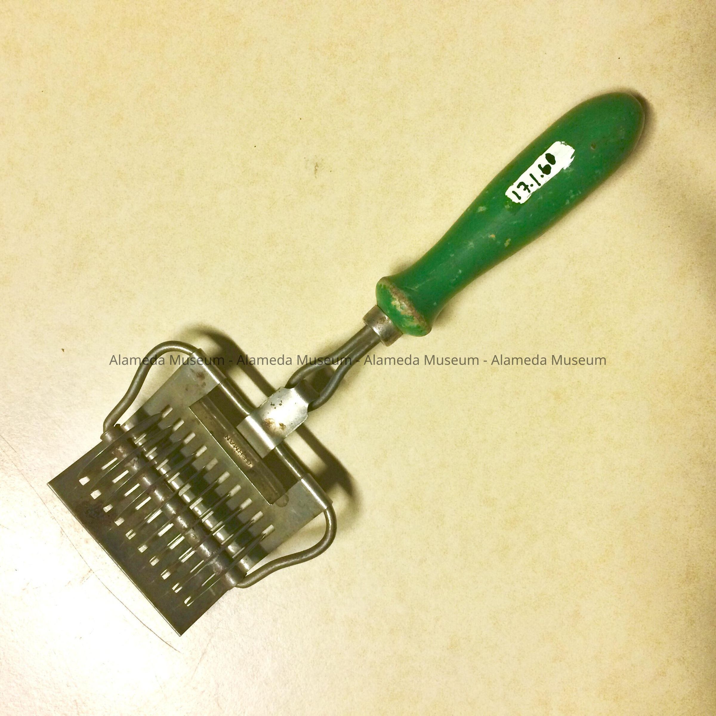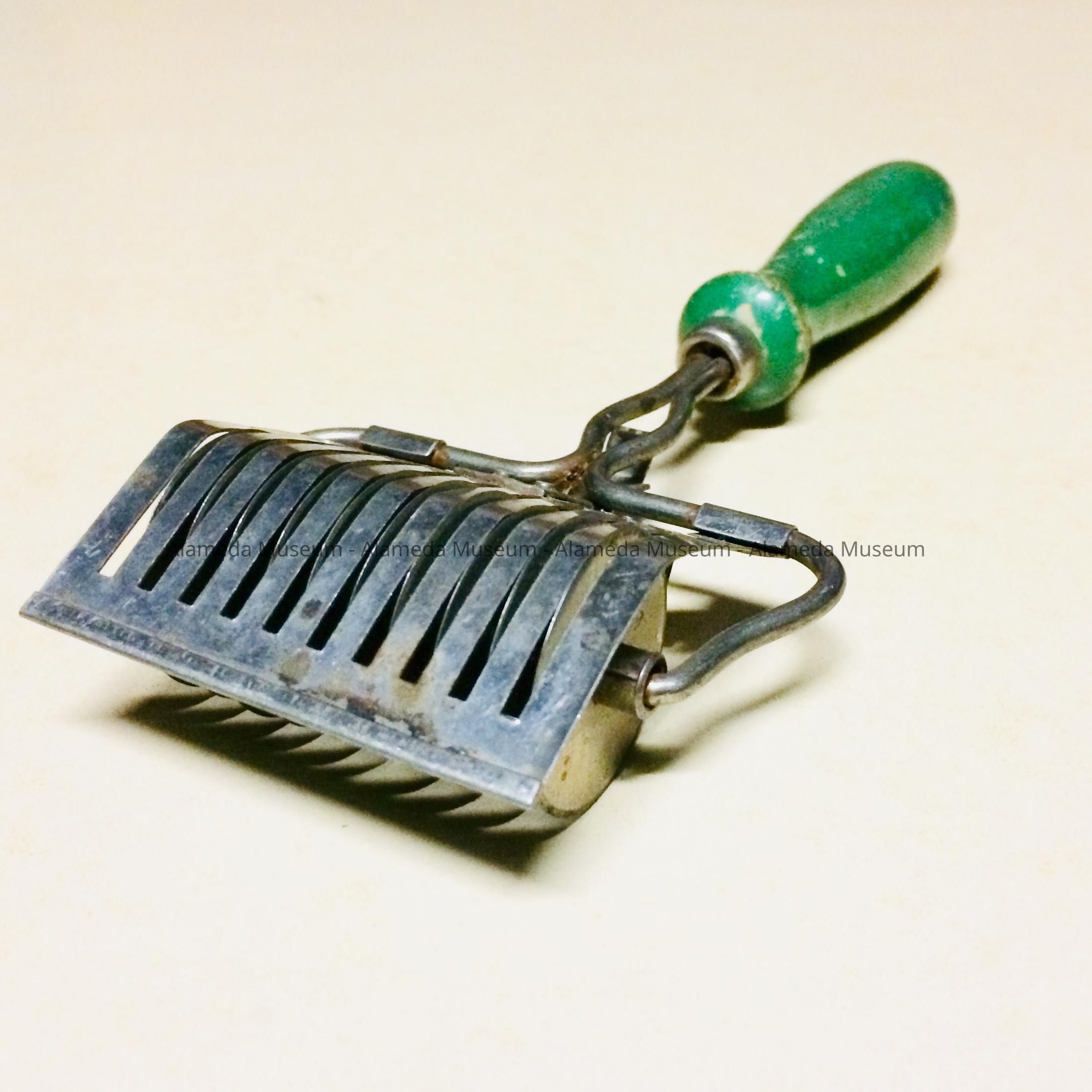 Description: A multi-bladed, nickel plated iron that is attached to a green wooden handle. The metal section is signed, "Germany".