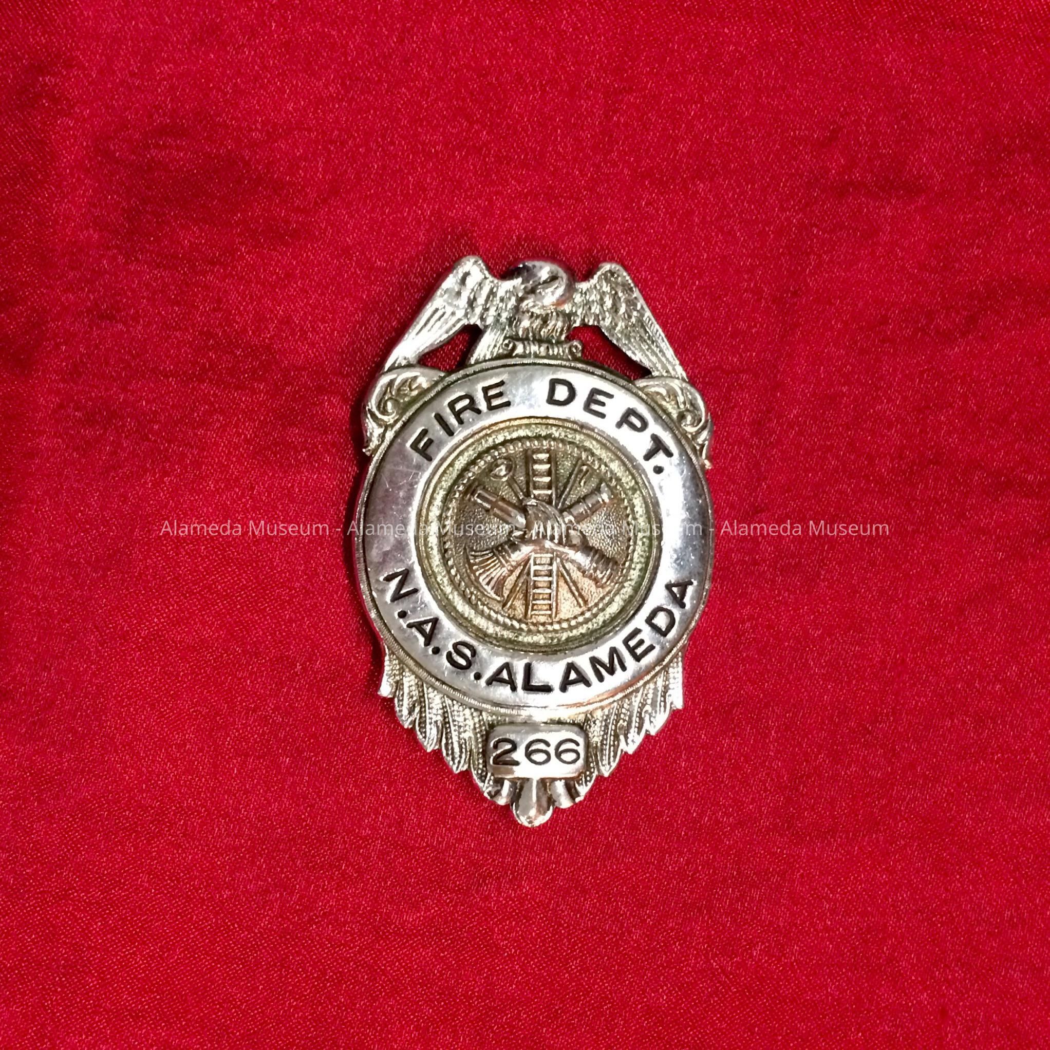 Description: Nickel-plated badge with incised caption: "Fire Dept, NAS, Alameda 266". No evidence of manufacturer.