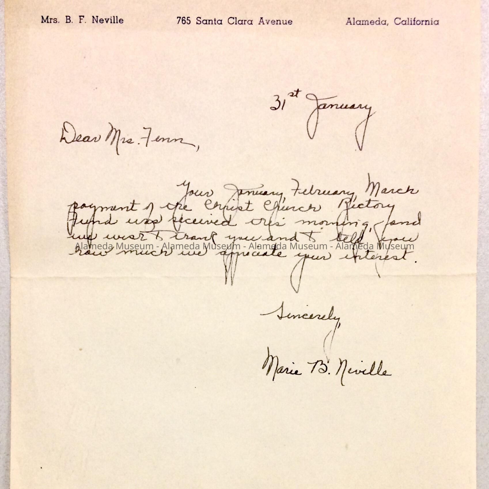 HISTORY OF OBJECT: A NOTE ADDRESSED TO MRS. FENN THANKING HER FOR HER DONATIONS TO THE RECTORY FUND AT CHRIST EPISCOPAL CHURCH, SANTA CLARA AVENUE AND GRAND STREET, ALAMEDA. THE NOTE WAS SIGNED BY MARIE B. NEVILLE.