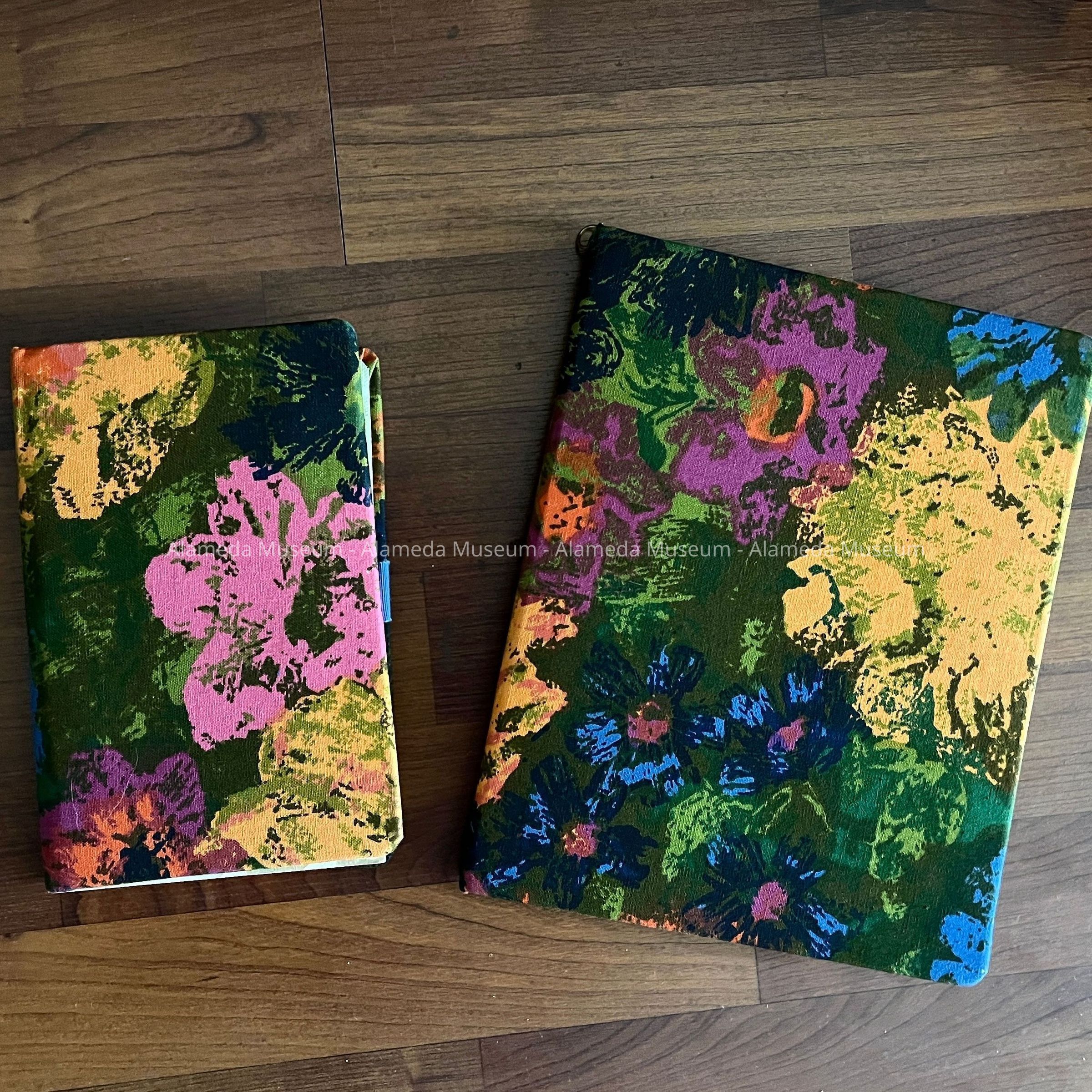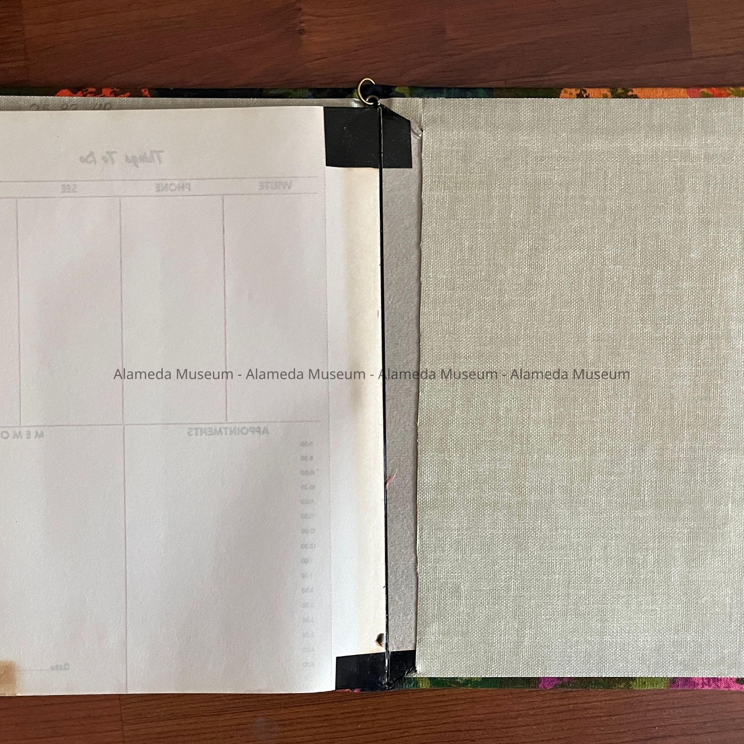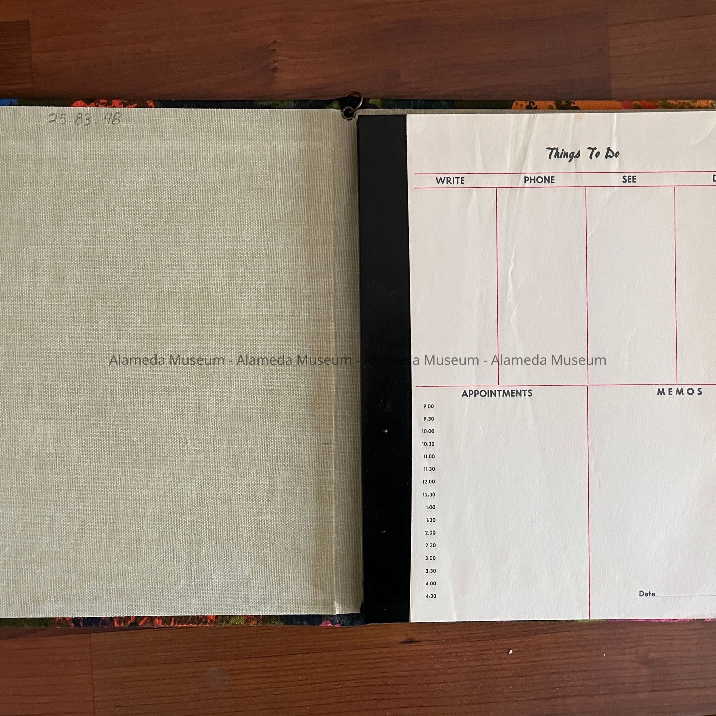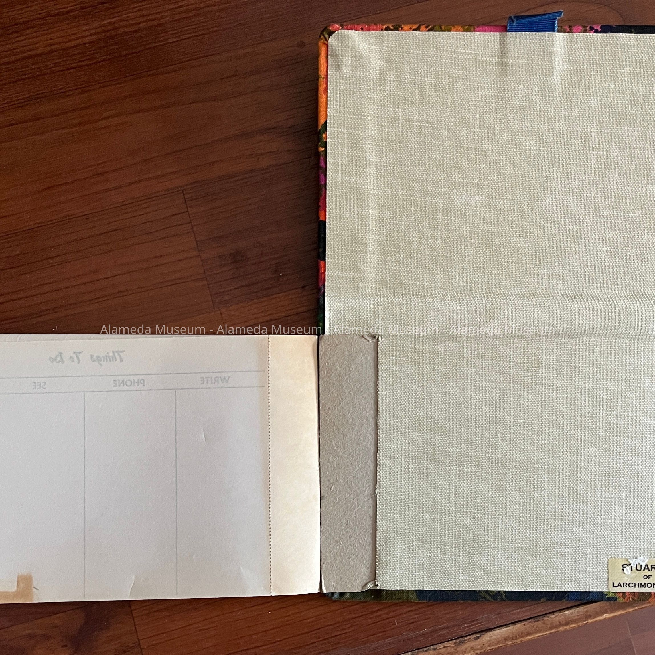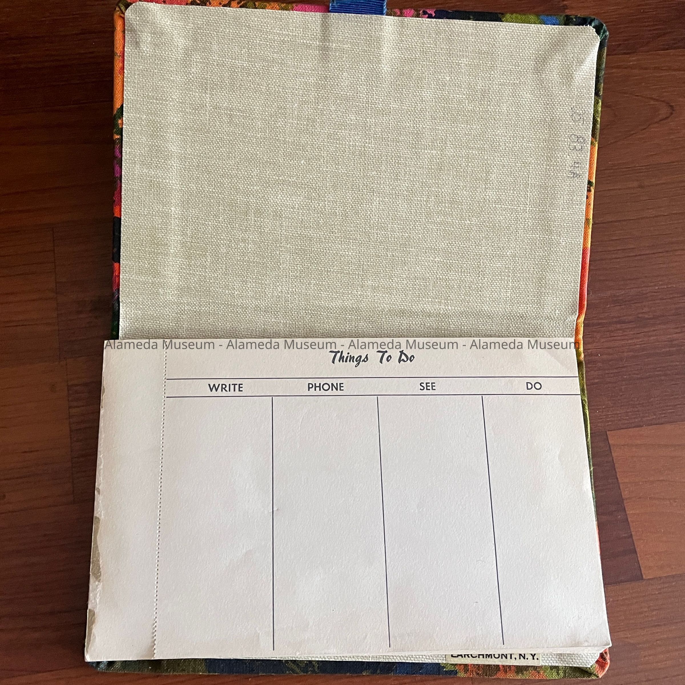History of Object: unused Notebook and Journal owned by Phyllis Diller, made to match the dress cataloged as 25.83.3. Donated for the exhibit at the Alameda Museum. From a book of quotes: "When a lady of society has her clothing custom-made, the seamstress will include a matching datebook and journal so the gentle lady can keep a diary of where she went and what she did wearing that dress."