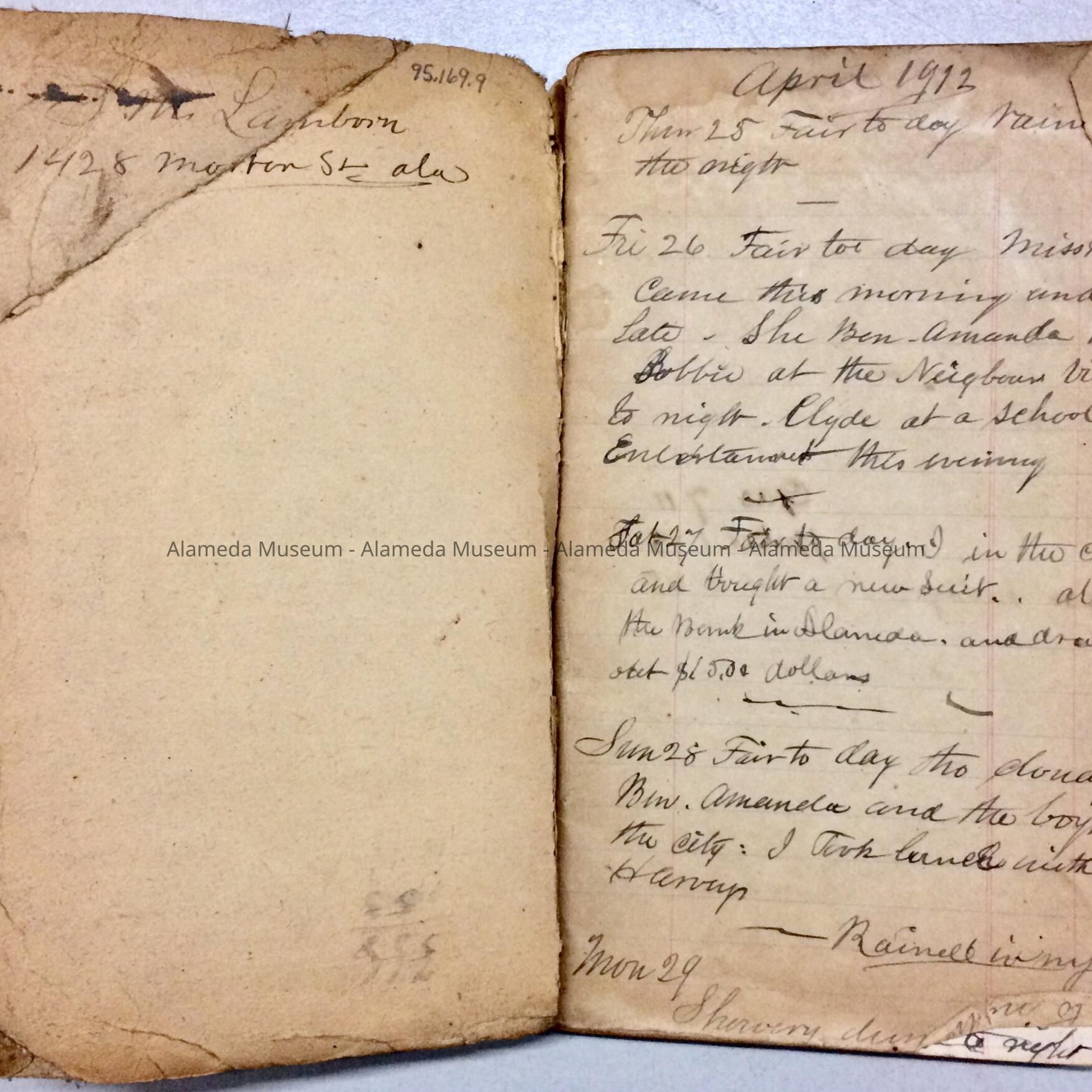 FIRST ENTRY DATED APRIL 25, 1912. ENTRIES RECORD WEATHER AND DAILY ACTIVITIES. WRITER SUFFERED TWO NASTY FALLS IN JULY OF 1912 AND SPENT ALMOST TWO MONTHS RECUPERATING AT HOME OF SON, HARVEY.