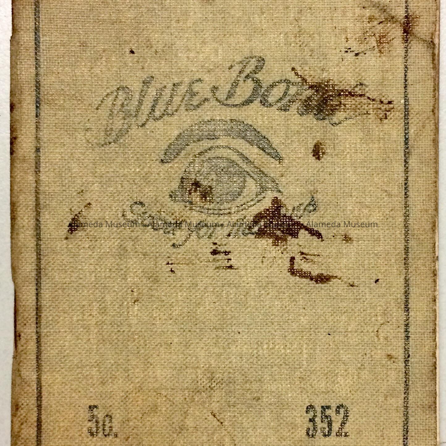NOTEBOOK, WITH LINED PAPER, COVERED WITH GRAY BUCKRAM. ON COVER STAMPED IN BLUE: "BLUE BOND/GOOD FOR THE EYES," WITH A LARGE OPEN EYE. BELOW APPEAR 5c AND THE NUMBER 352. HANDWRITTEN ON INSIDE OF COVERS, FRONT AND BACK, IN BLACK INK: "S M LAMBORN, 1428 MORTON ST, ALAMEDA."