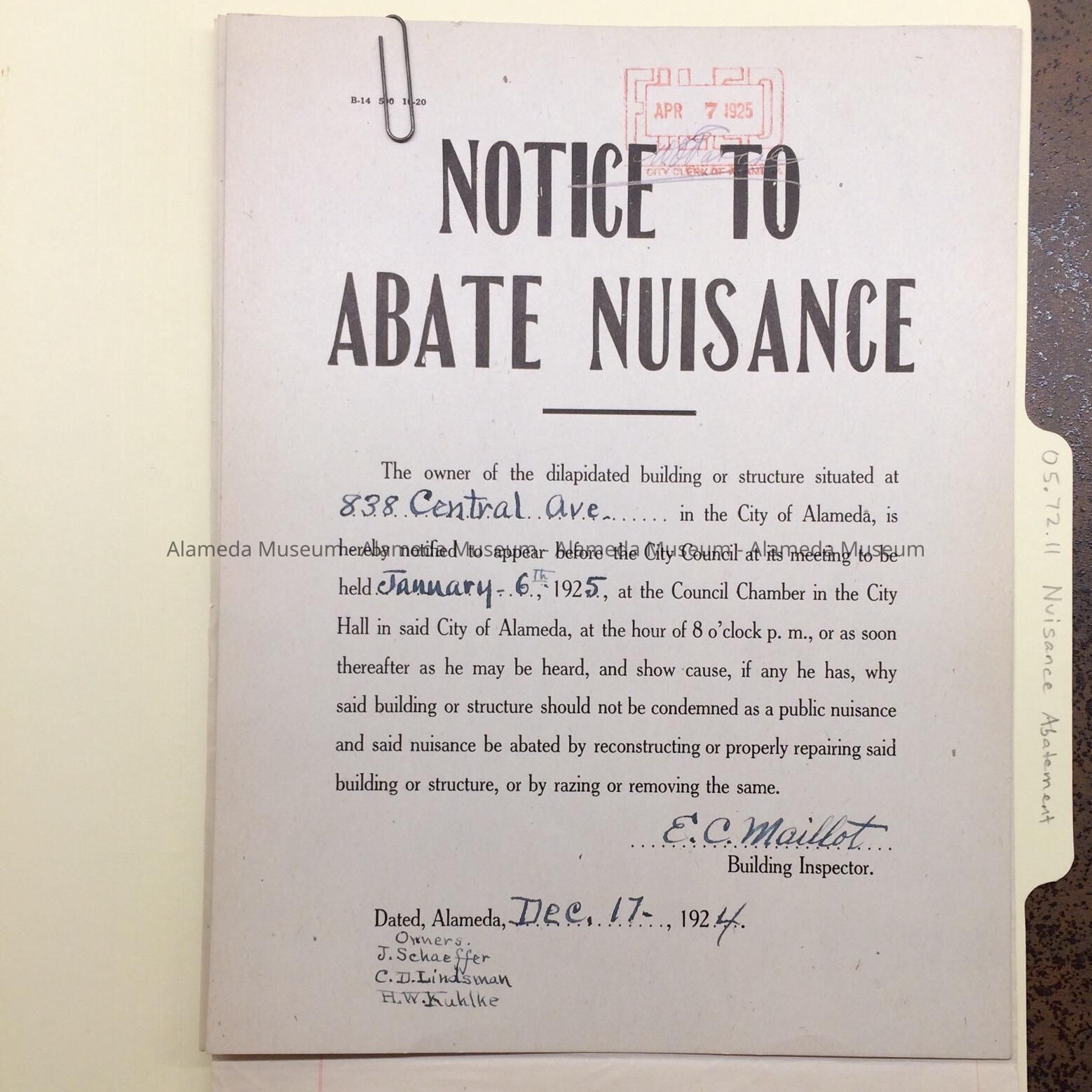 Notice about derelict property at 838 Central Ave, 1924-1925Entry/Object ID