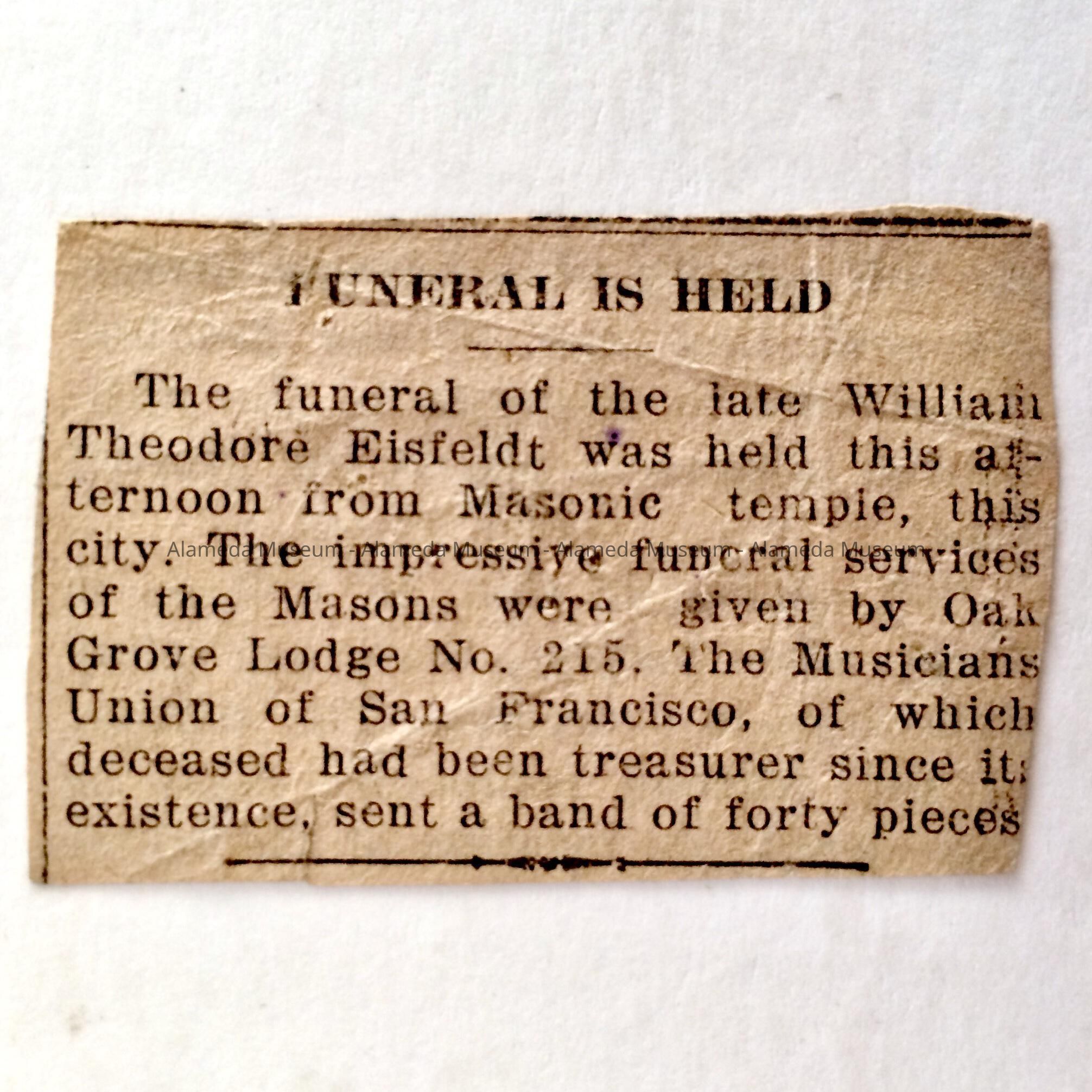 History of Object: Notice of funeral of Theodore Eisfeldt who came to Alameda in 1892.
