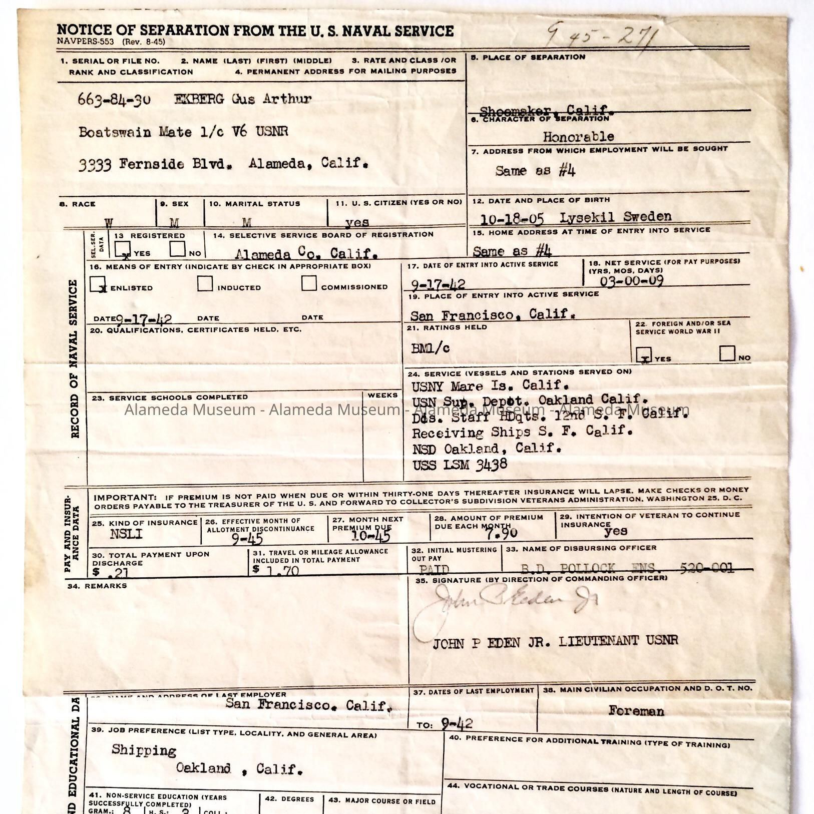HISTORY OF OBJECT: NOTICE OF SEPARATION FROM THE U.S. NAVAL SERVICE, ISSUED TO GUS EKBERG, BOATSWAIN'S MATE, U.S. NAVAL RESERVE, 3333 FERNSIDE BOULEVARD, ALAMEDA